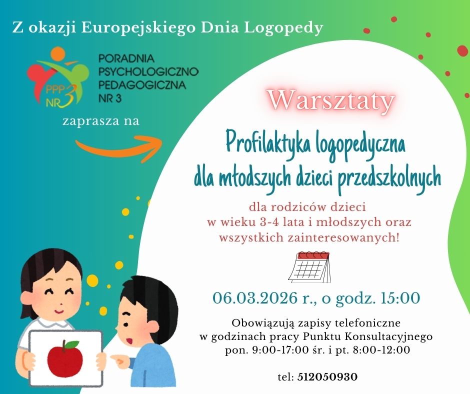 W związku ze zbliżającym się Europejskim Dniem Logopedy zapraszamy na warsztaty 'Profilaktyka logopedyczna dla młodszych dzieci przedszkolnych', które odbędą się 6 marca o godzinie 15.00 w budynku PPP nr 3 w Radomiu.