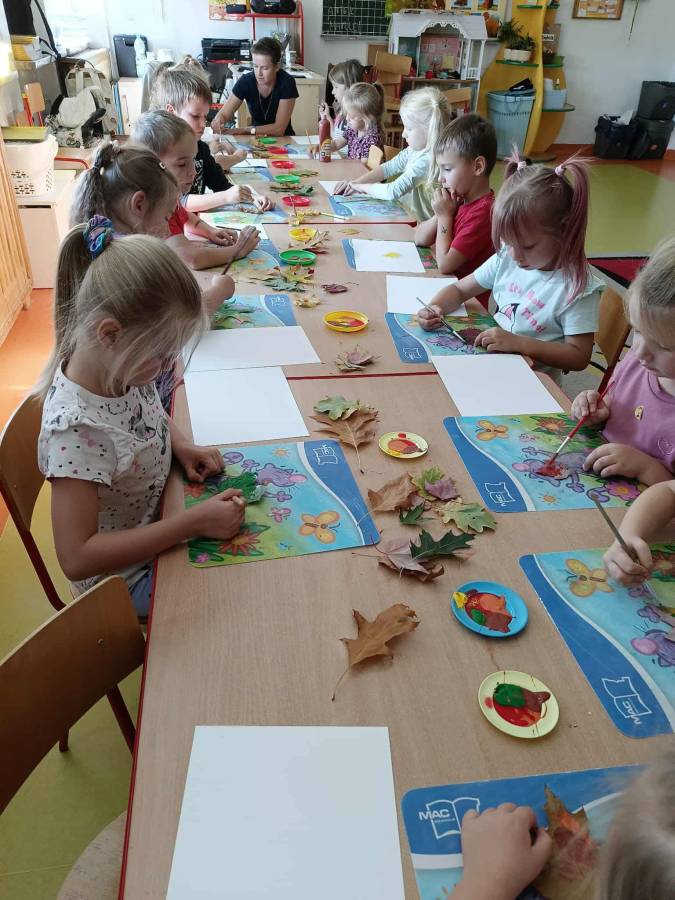 W grupie Kotków bardzo dużo się dzieje! Warsztaty z robotyki, eksperymenty oraz jesienne zabawy: malowanie, odbijanie liści.