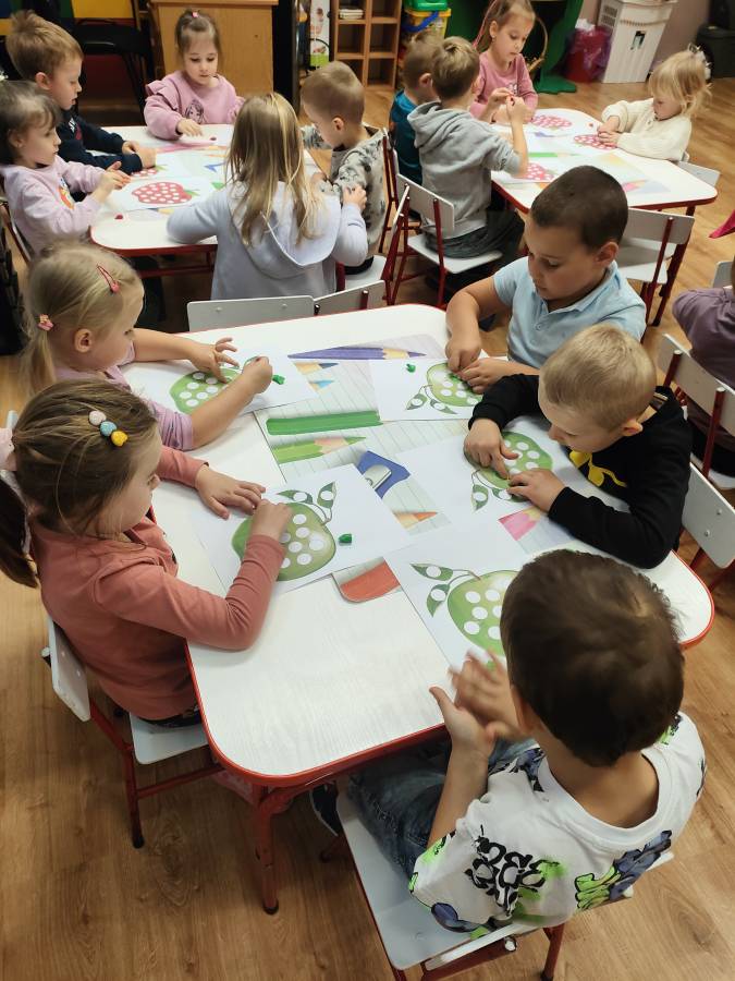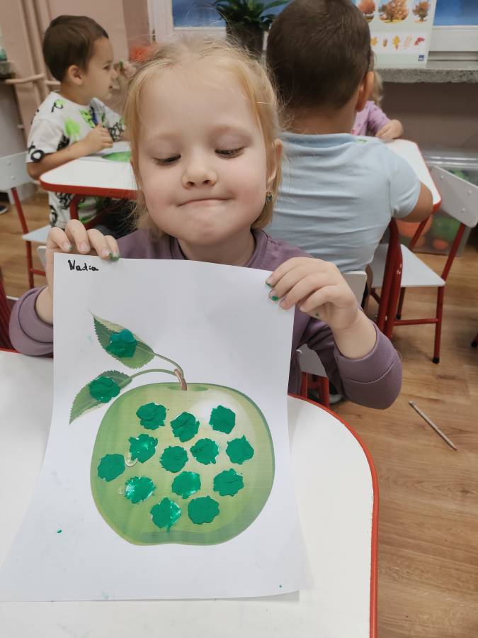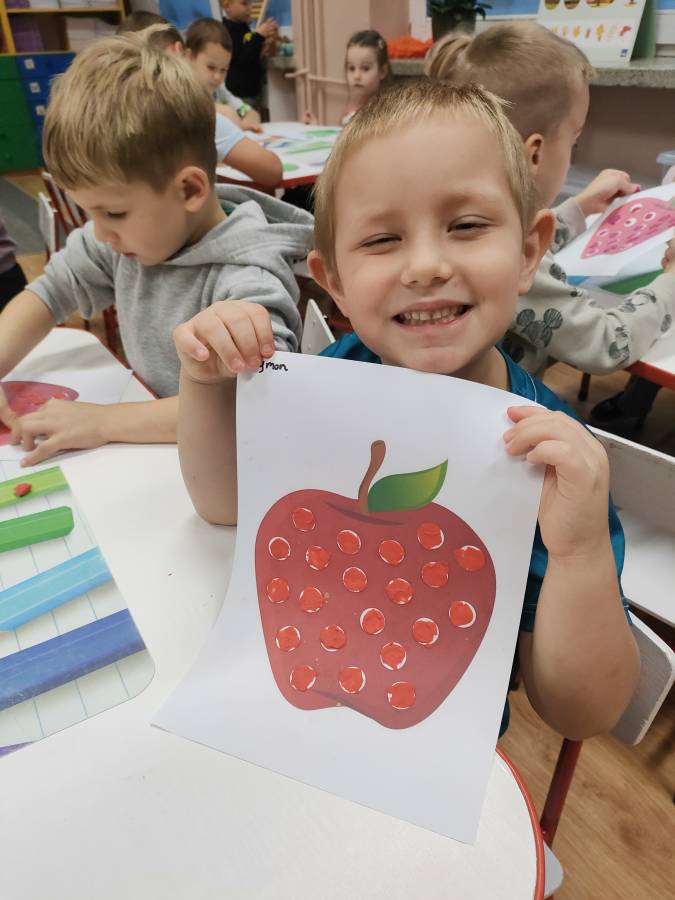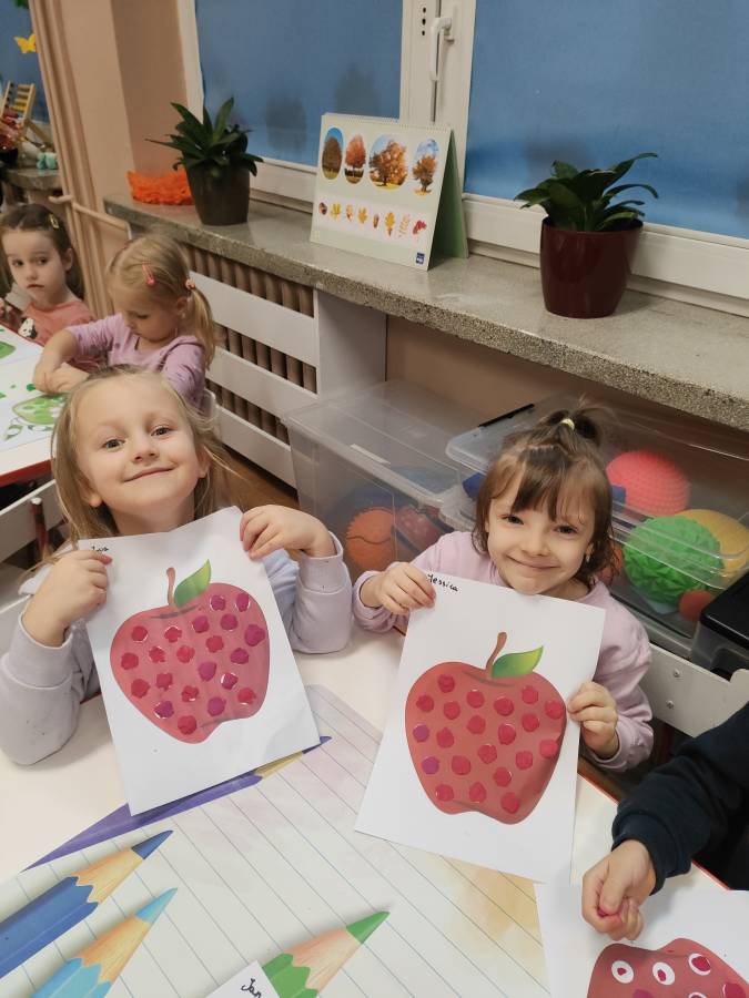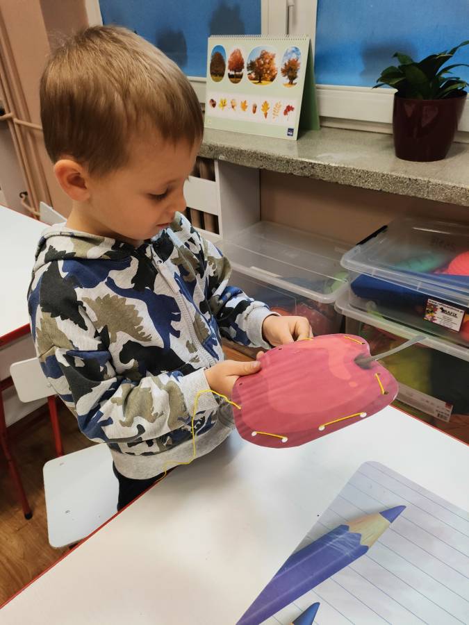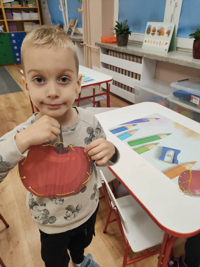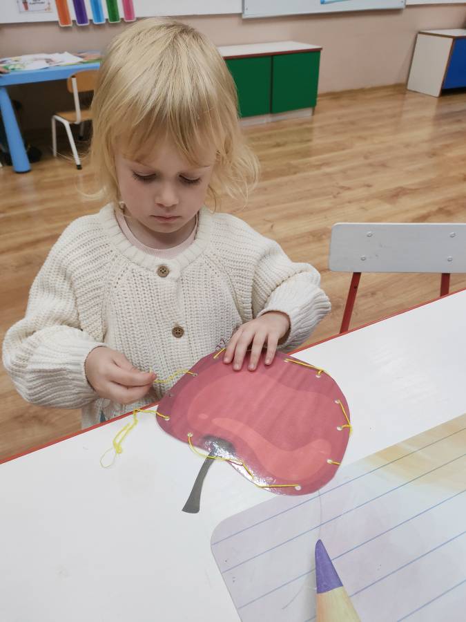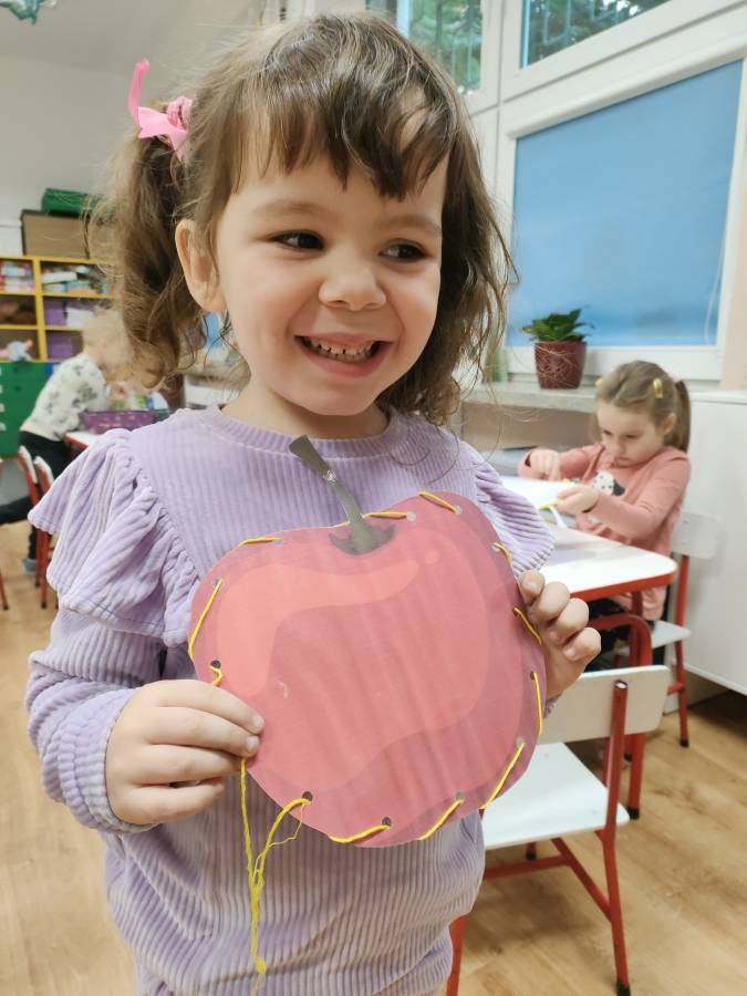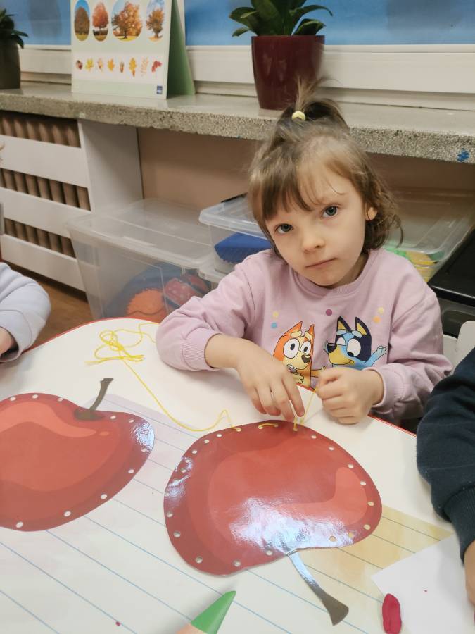 Motylki z okazji Dnia Jabłka podążając po ścieżce ułożonej z darów jesieni, dotarły do jabłka, rozwijając przy tym koordynację i orientację przestrzenną. Następnie wyklejały jabłka plasteliną oraz przeplatały je sznureczkiem, doskonaląc motorykę małą i cierpliwość.