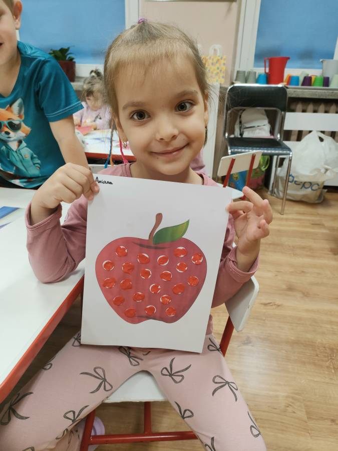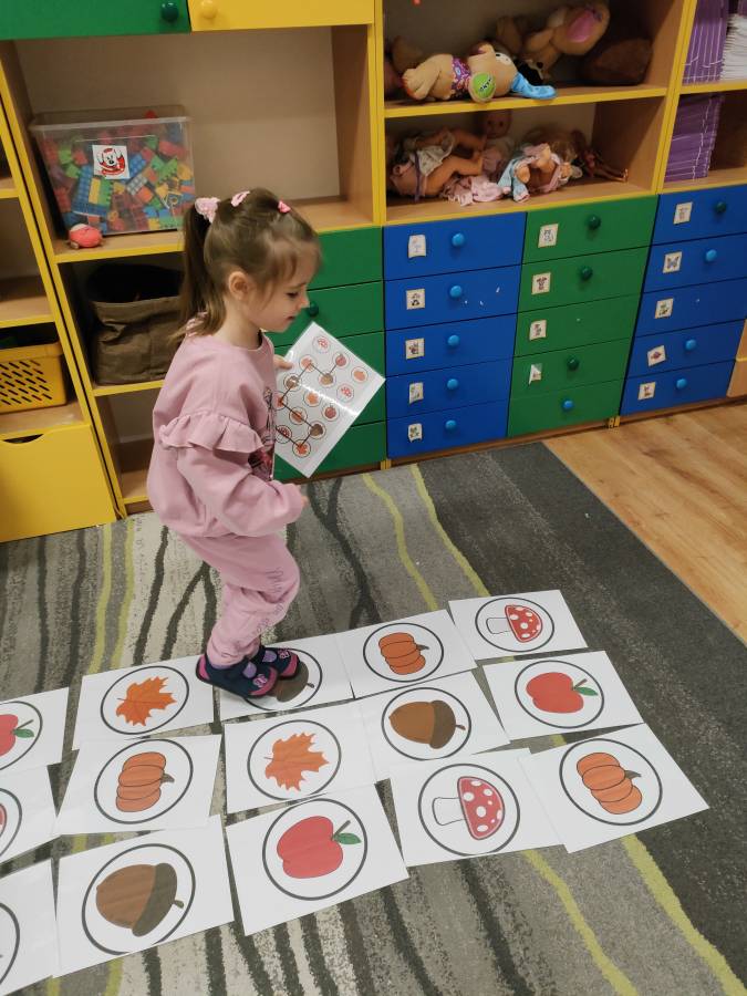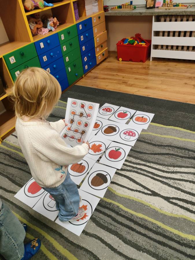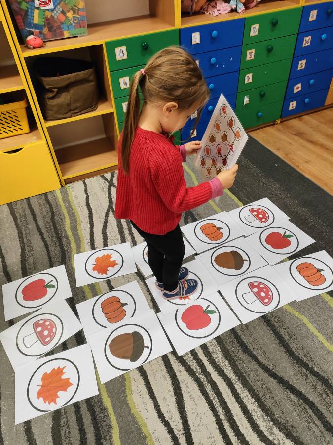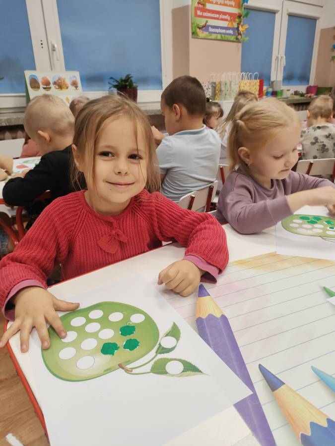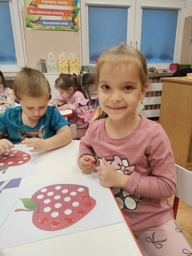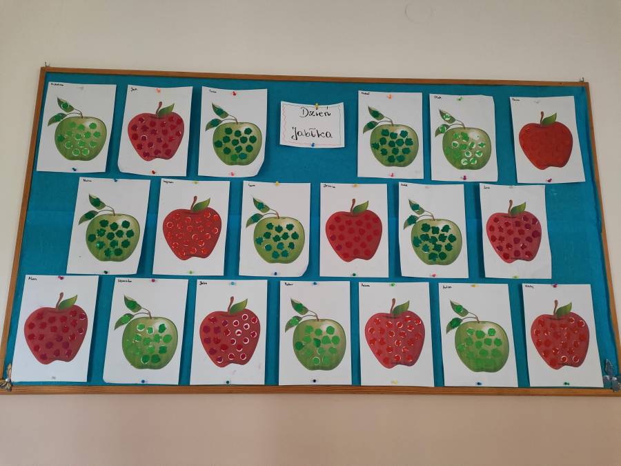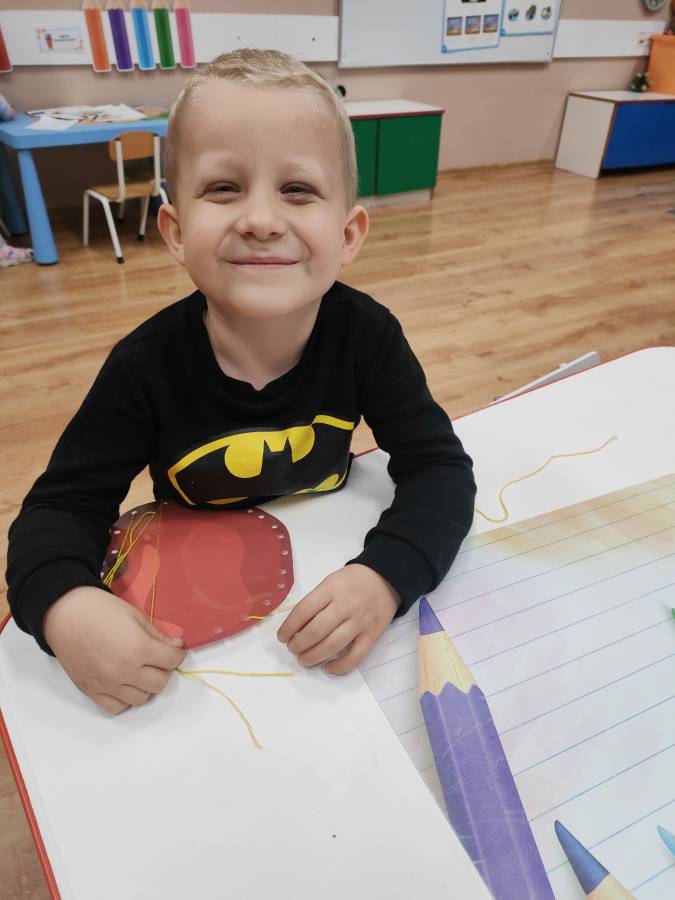 Motylki z okazji Dnia Jabłka podążając po ścieżce ułożonej z darów jesieni, dotarły do jabłka, rozwijając przy tym koordynację i orientację przestrzenną. Następnie wyklejały jabłka plasteliną oraz przeplatały je sznureczkiem, doskonaląc motorykę małą i cierpliwość.