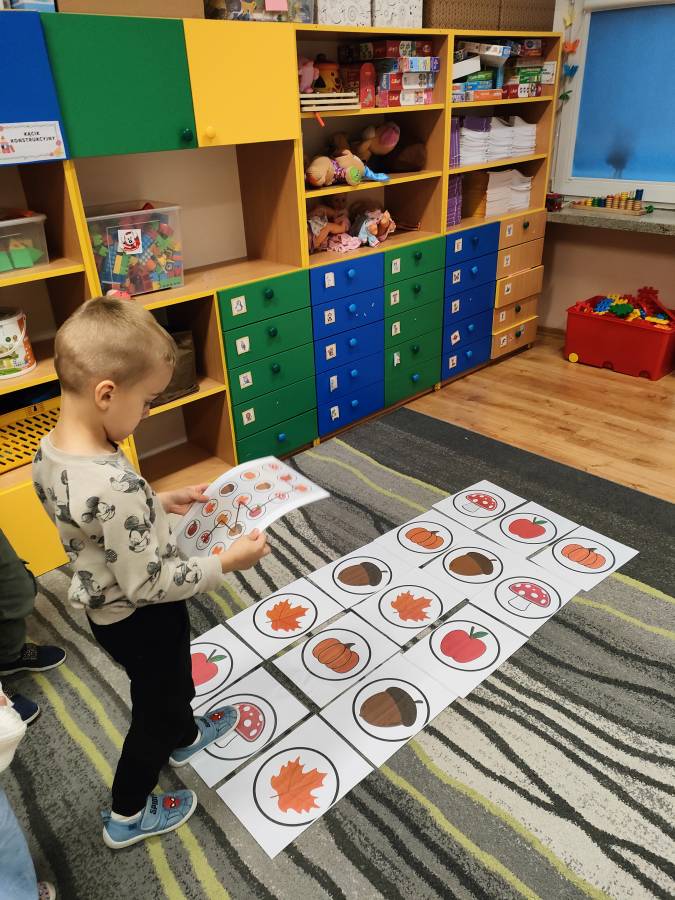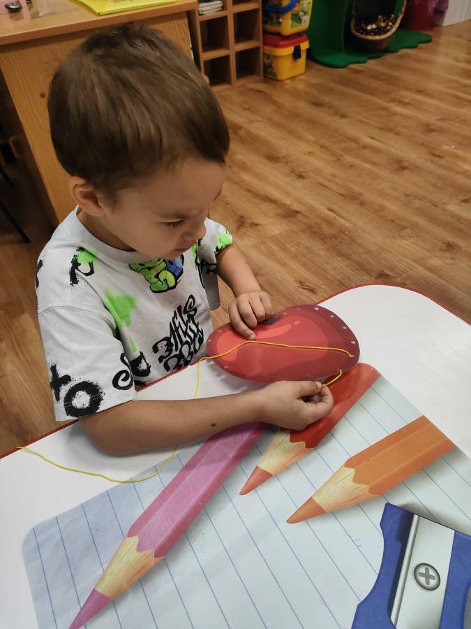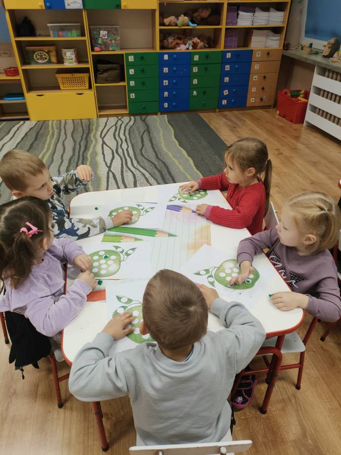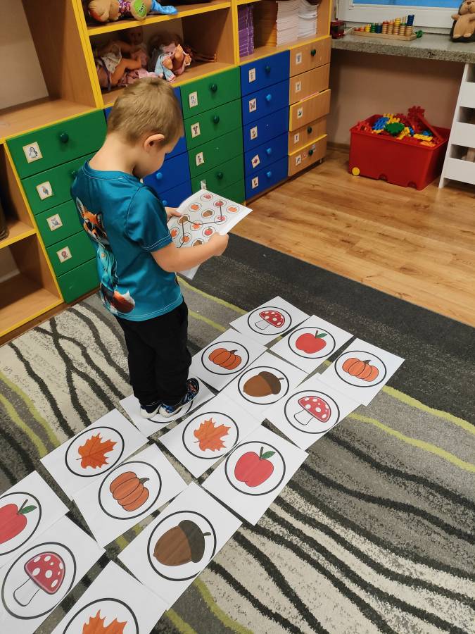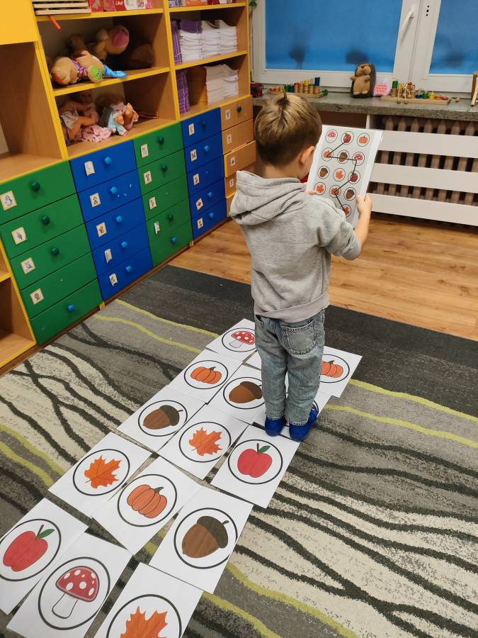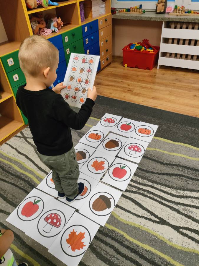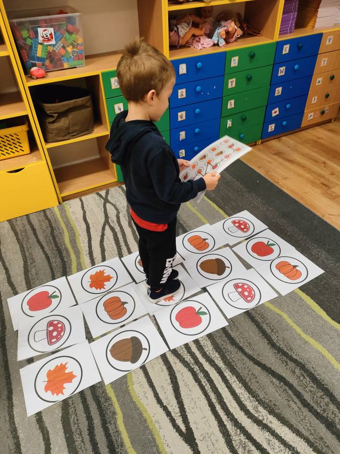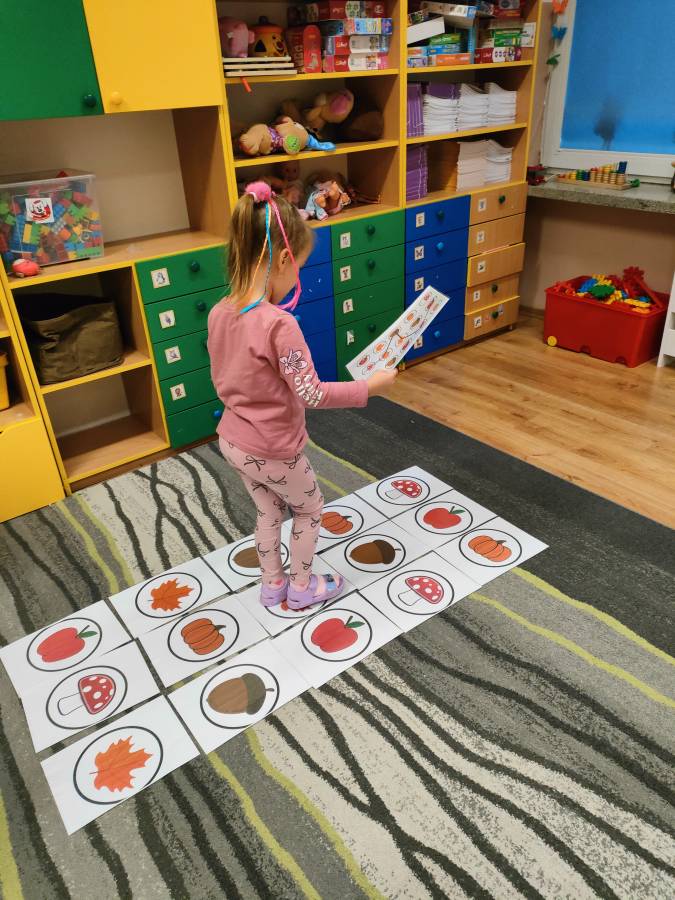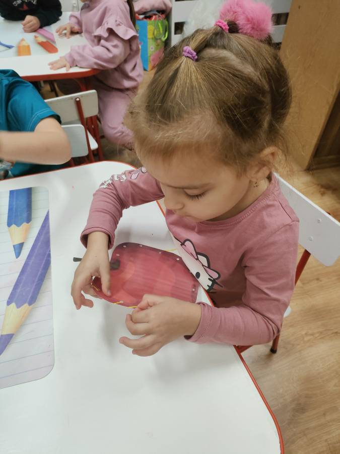 Motylki z okazji Dnia Jabłka podążając po ścieżce ułożonej z darów jesieni, dotarły do jabłka, rozwijając przy tym koordynację i orientację przestrzenną. Następnie wyklejały jabłka plasteliną oraz przeplatały je sznureczkiem, doskonaląc motorykę małą i cierpliwość.