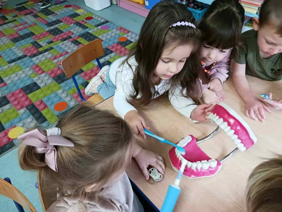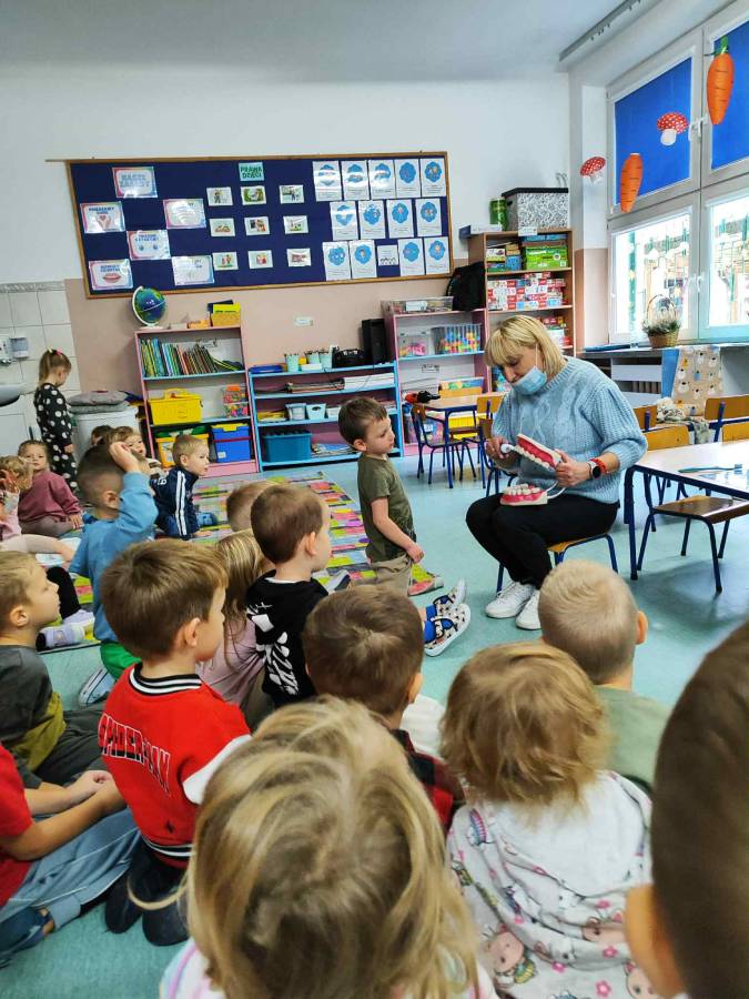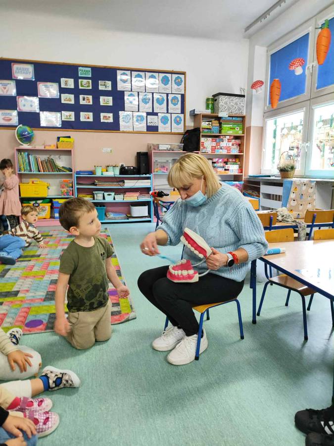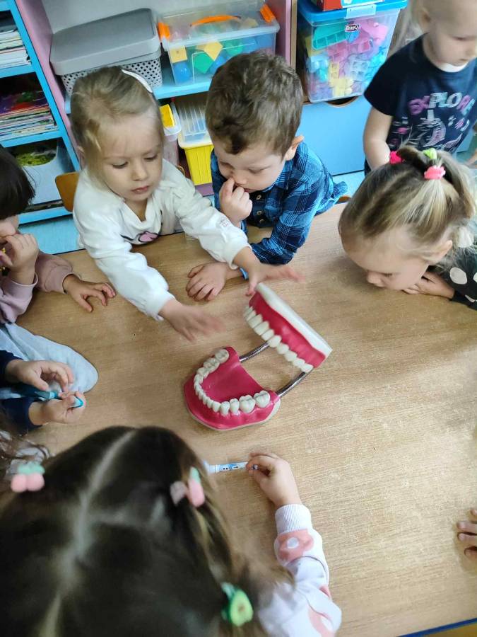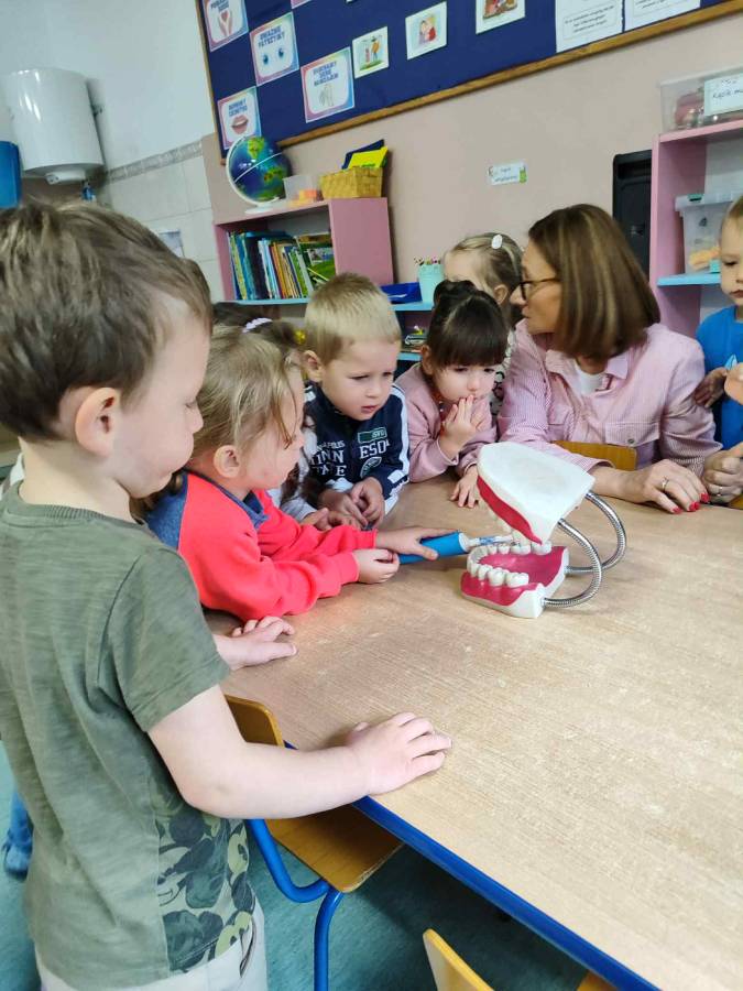 Ślimaczki i Jagódki odwiedziła dzisiaj Pani stomatolog, która pokazała jak prawidłowo szczotkować i dbać o zęby, a także przeprowadziła przegląd stomatologiczny. Dzielne przedszkolaki w nagrodę otrzymały naklejki i dyplomy.