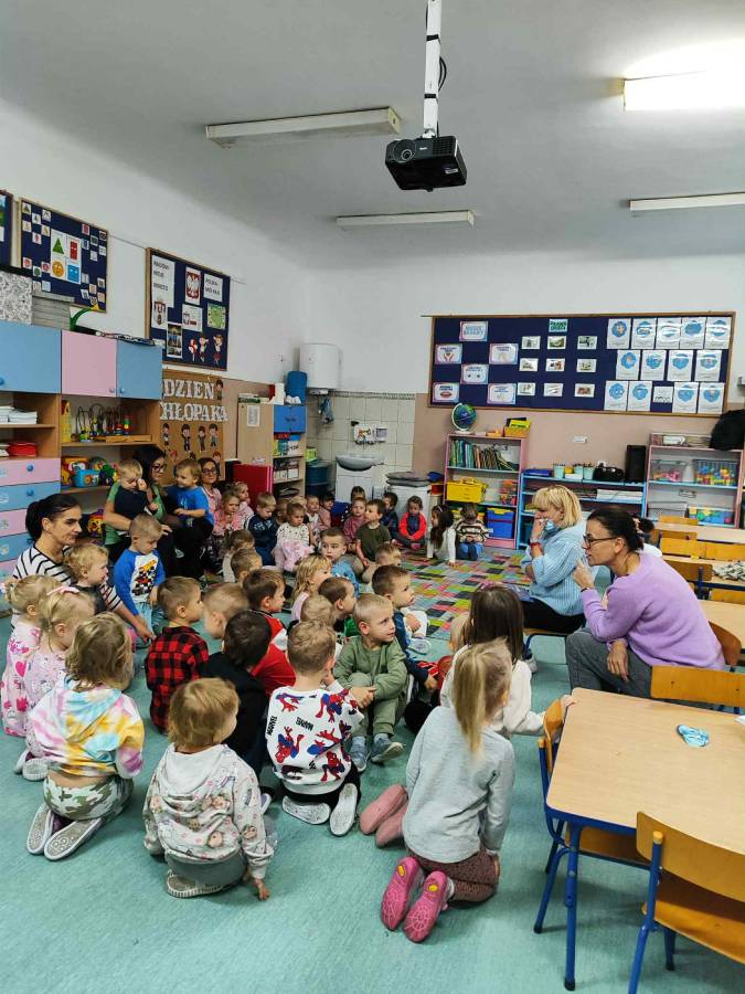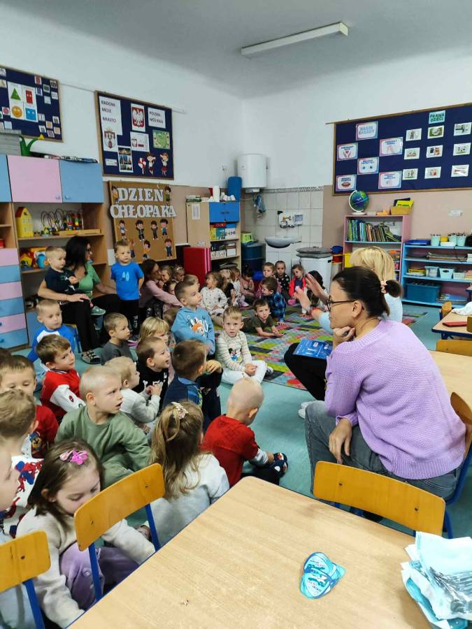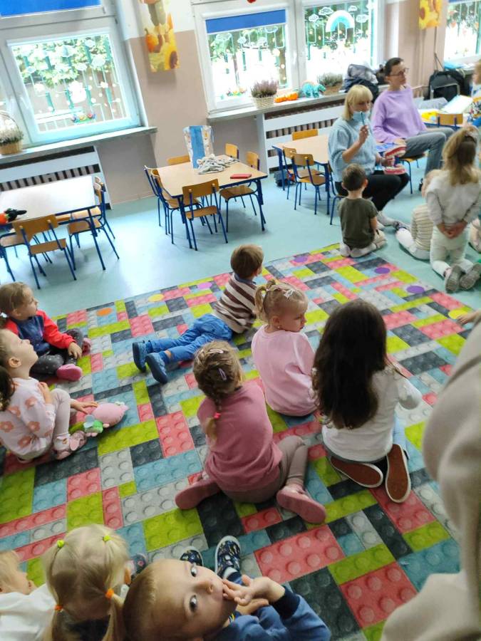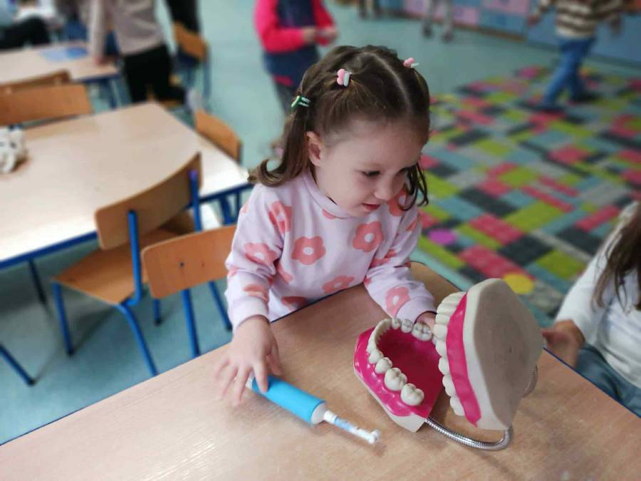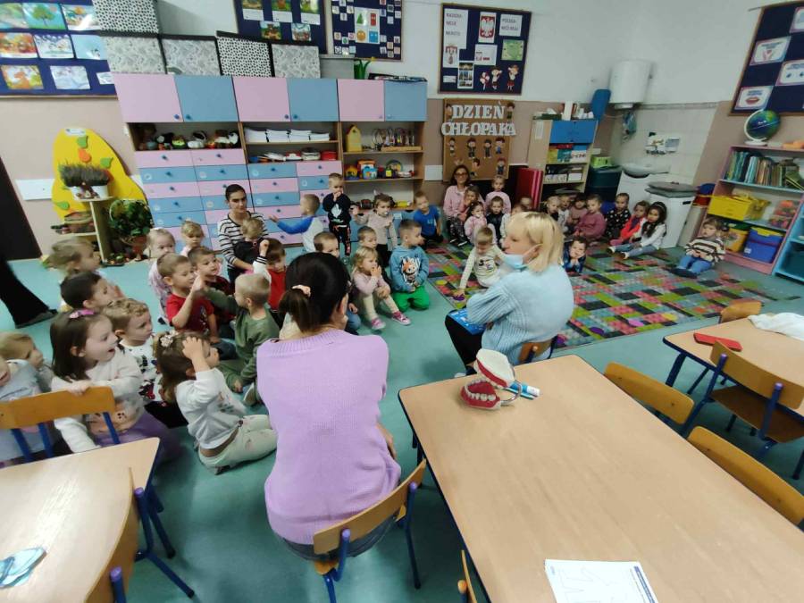 Ślimaczki i Jagódki odwiedziła dzisiaj Pani stomatolog, która pokazała jak prawidłowo szczotkować i dbać o zęby, a także przeprowadziła przegląd stomatologiczny. Dzielne przedszkolaki w nagrodę otrzymały naklejki i dyplomy.