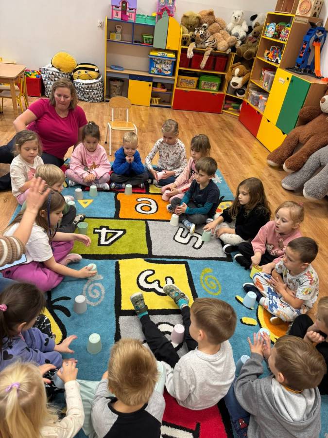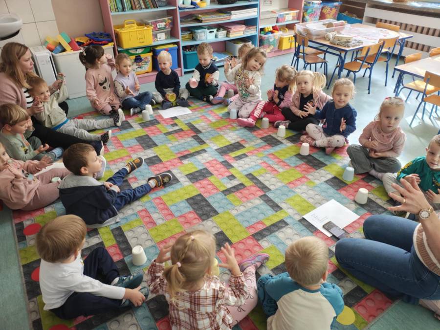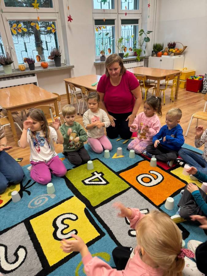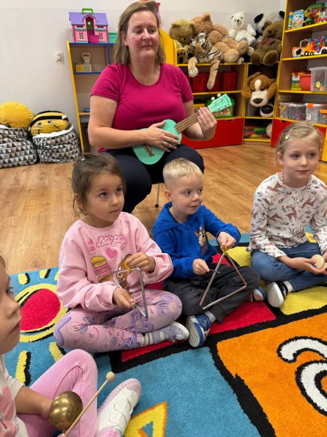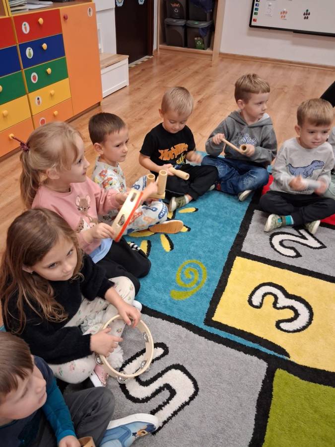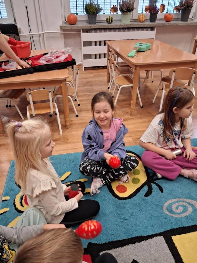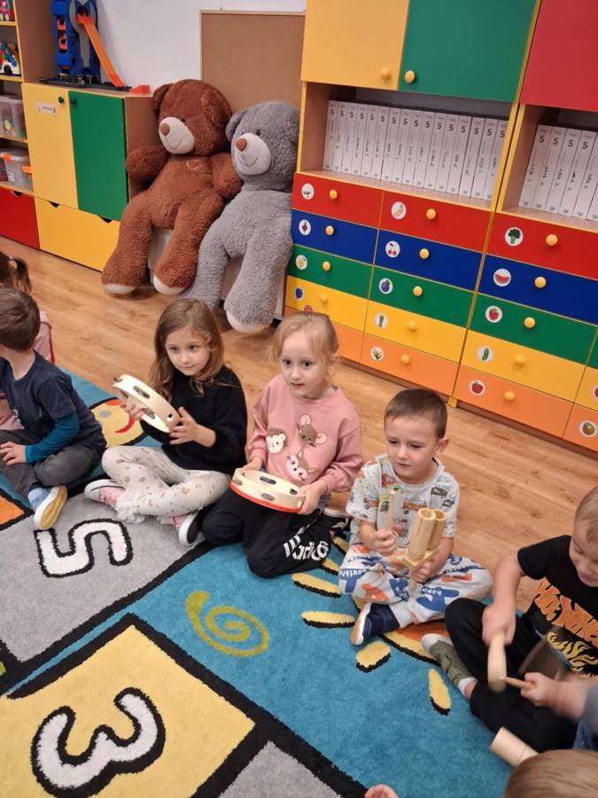 1 października obchodziliśmy Międzynarodowy Dzień Muzyki. Z tej okazji w grupach Ślimaczki i Pszczółki odbyły się wyjątkowe zajęcia logopedyczno-muzyczne. Dzieci rozpoczęły od ćwiczeń usprawniających aparat mowy, które połączone były z rytmiczną zabawą. Następnie wykonywały różnorodne polecenia w rytm muzyki, rozwijając przy tym słuch i koordynację ruchową. Mali artyści stworzyli także własne orkiestry, wykorzystując instrumenty perkusyjne. Na zakończenie zajęć dzieci zaprezentowały układ ruchowy z rekwizytami, poruszając się zgodnie z muzyką. Było radośnie, twórczo i bardzo muzycznie!