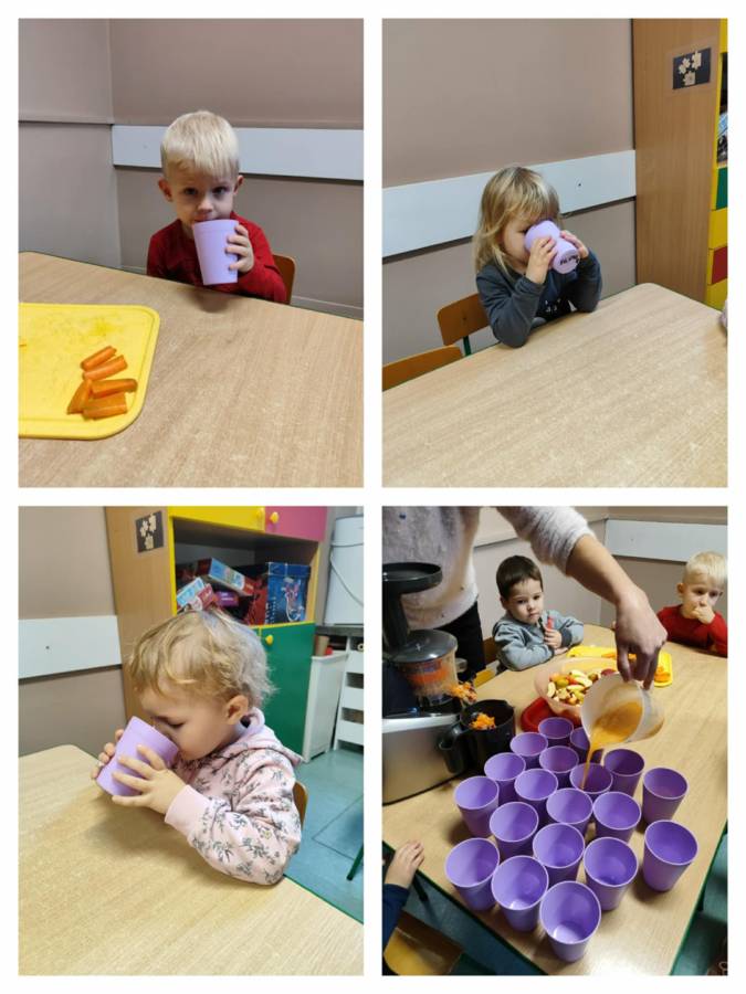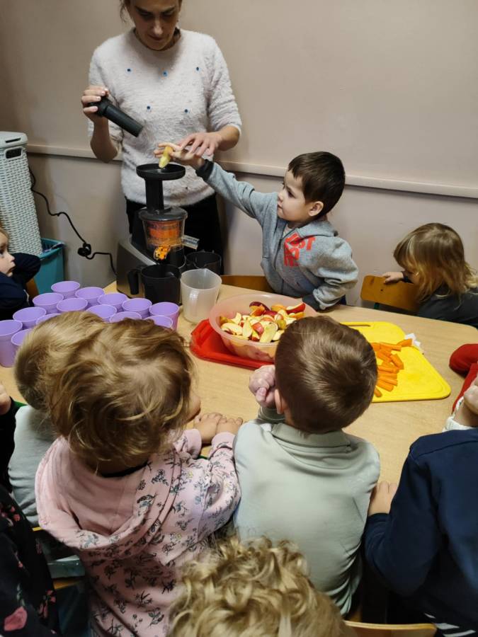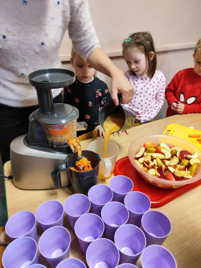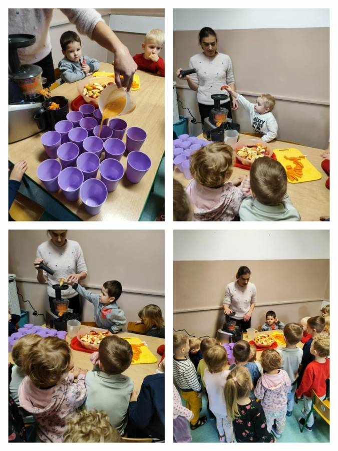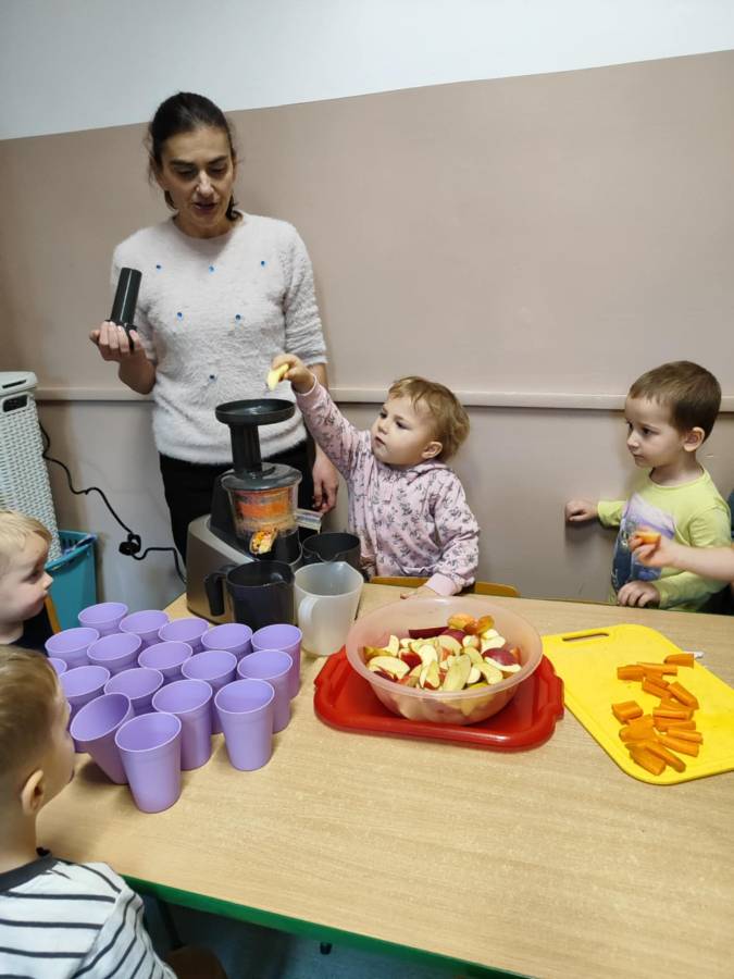 Zajęcia z projektu "Postaw na wartości - postaw na zdrowie"-ogólnopolski projekt edukacyjny krąg lV " - warzywa i owoce mają super moce. Dzieci z grupy Jagódek nazywały i próbowały warzywa i owoce oraz wspólnie robiły sok, który wyszedł pyszny i miał w sobie super moc.