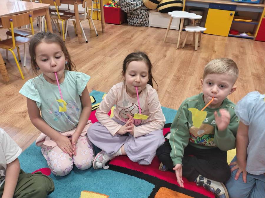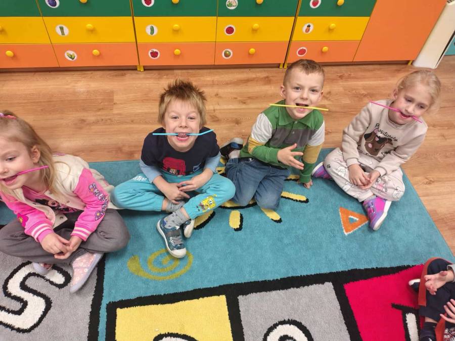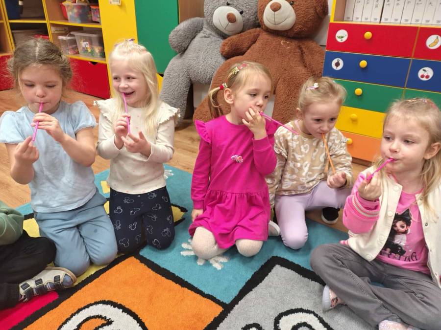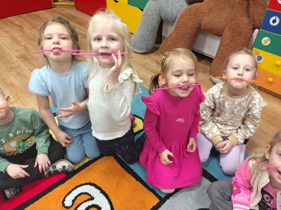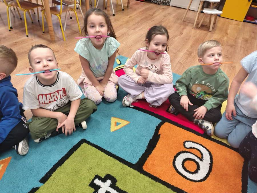 Podczas zajęć dzieci usprawniały aparat mowy poprzez różnorodne ćwiczenia artykulacyjne. Następnie z wykorzystaniem słomek przedszkolaki wykonywały ćwiczenia oddechowe, które wspomagały naukę prawidłowej realizacji głosek.