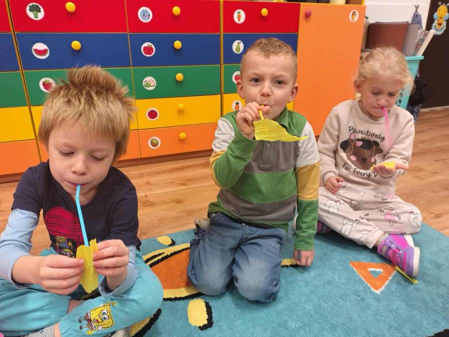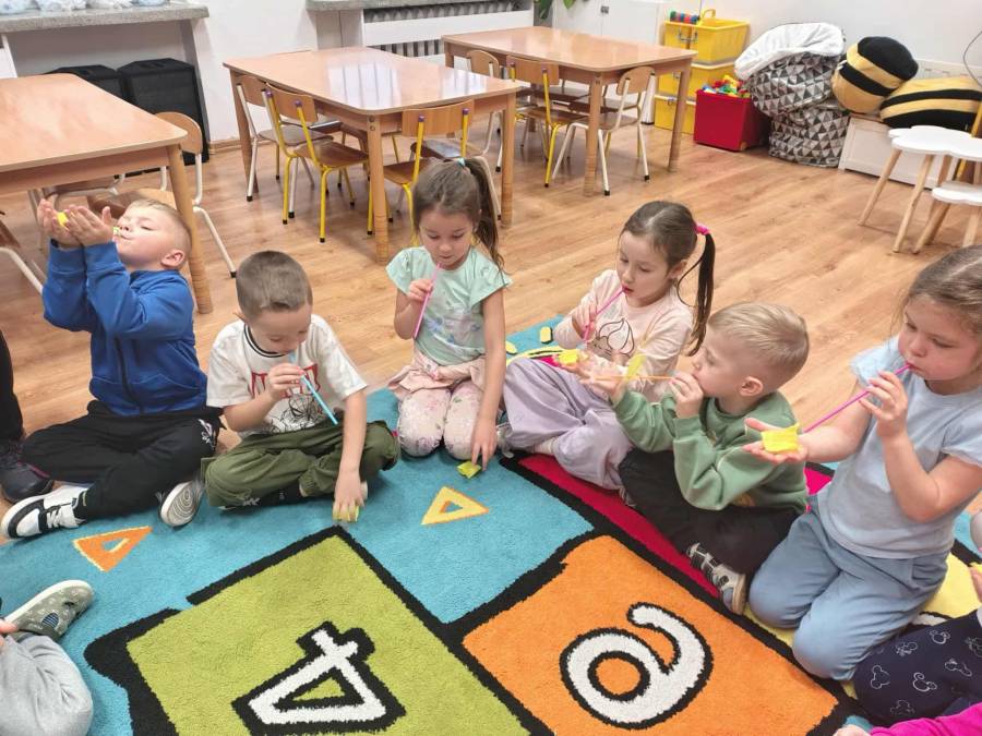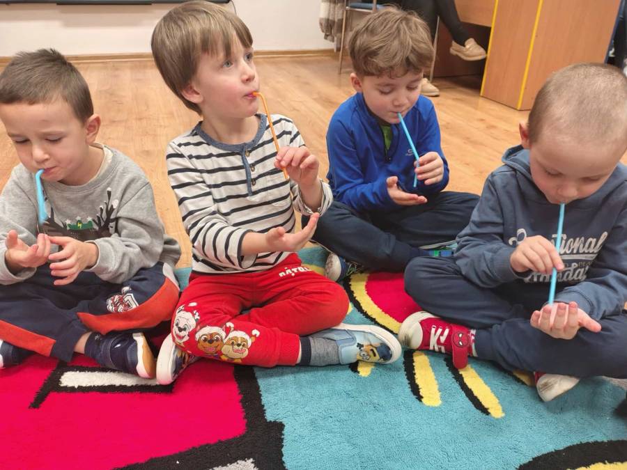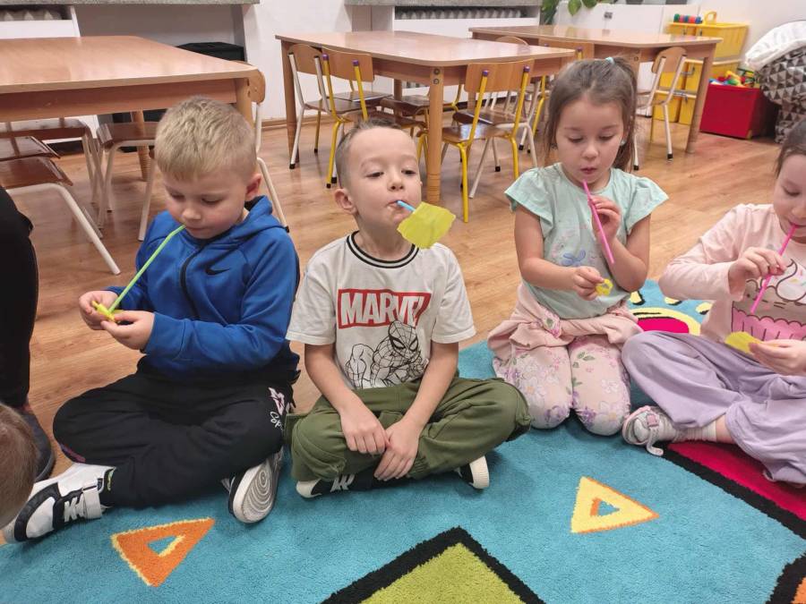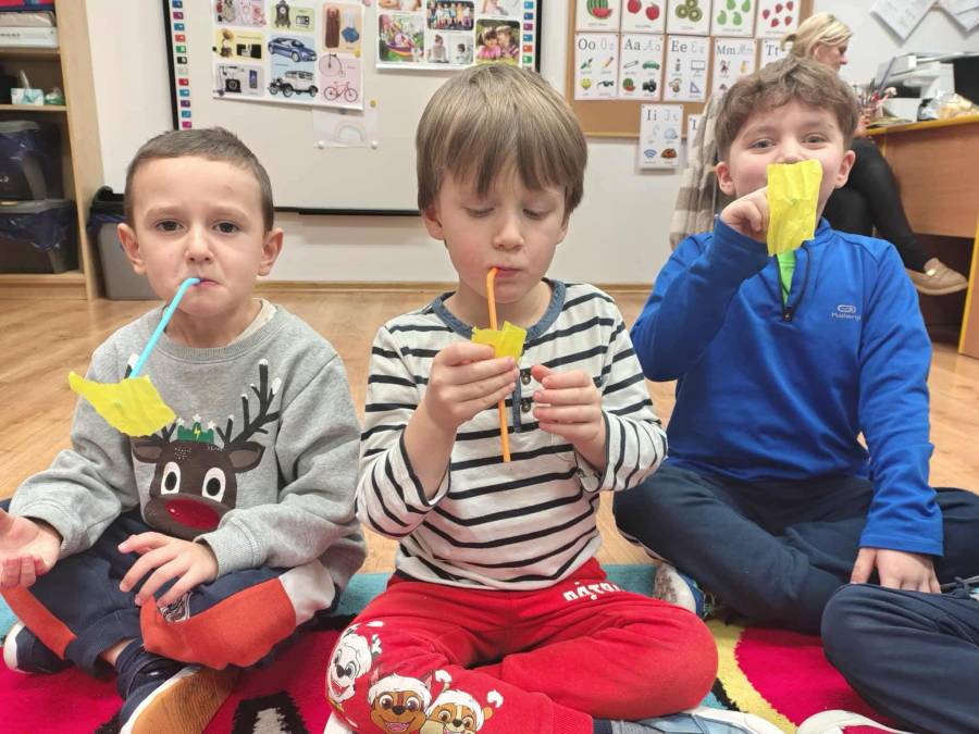 Podczas zajęć dzieci usprawniały aparat mowy poprzez różnorodne ćwiczenia artykulacyjne. Następnie z wykorzystaniem słomek przedszkolaki wykonywały ćwiczenia oddechowe, które wspomagały naukę prawidłowej realizacji głosek.