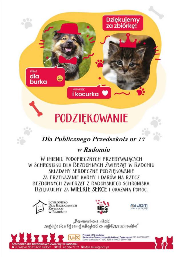 Los bezdomnych zwierząt nie jest nam obojętny. Zakończyliśmy zbiórkę potrzebnych rzeczy dla podopiecznych przebywających w Schronisku dla bezdomnych zwierząt w Radomiu. Dziękujemy z całego serca.