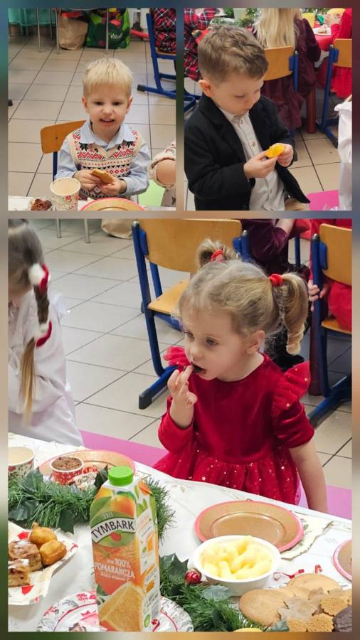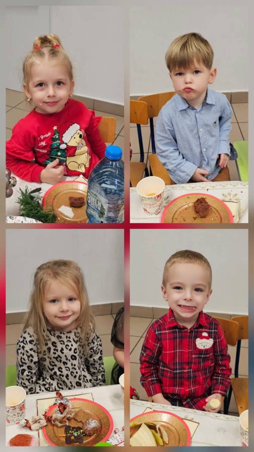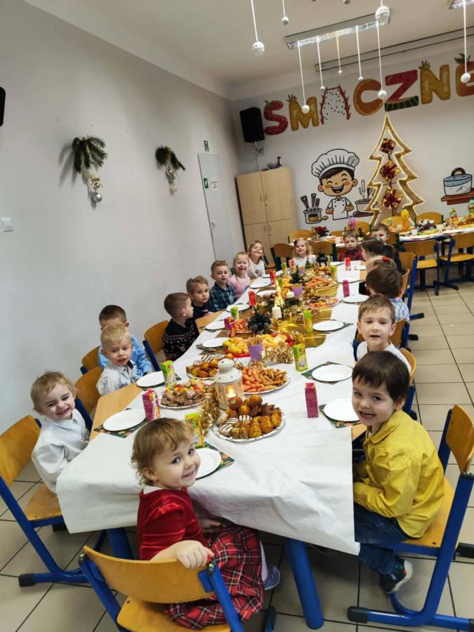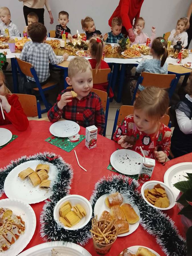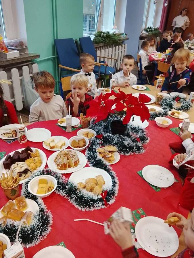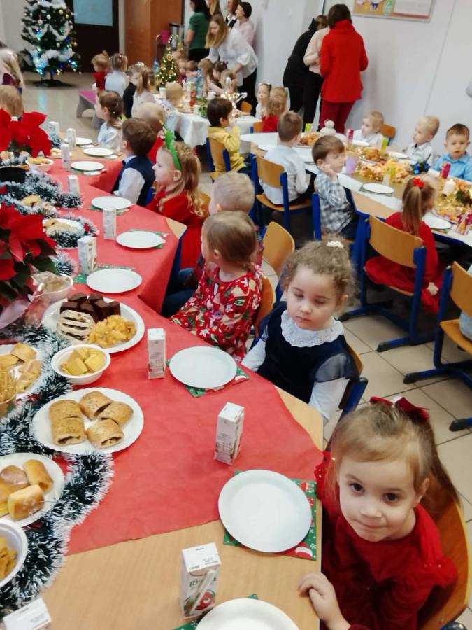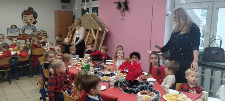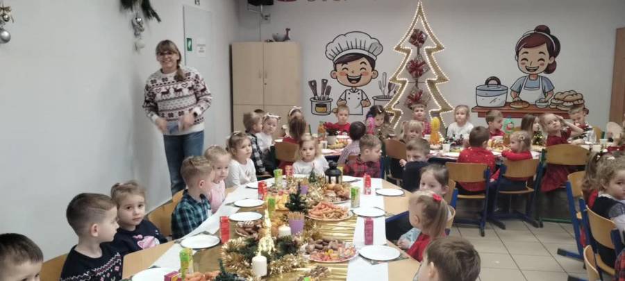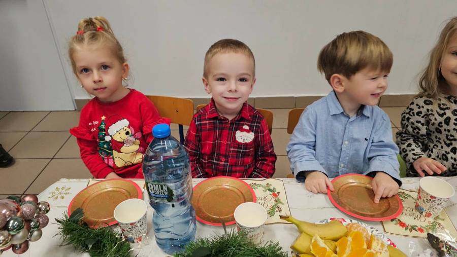 Dziś grupy Ślimaczki, Jagódki, Kropeczki, Motylki i Pszczółki spotkały się przy wigilijnym stole.