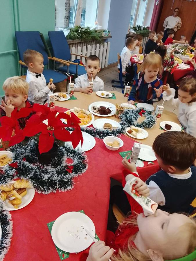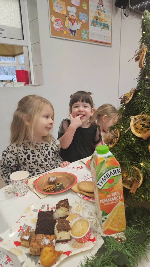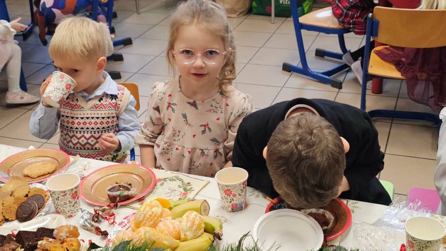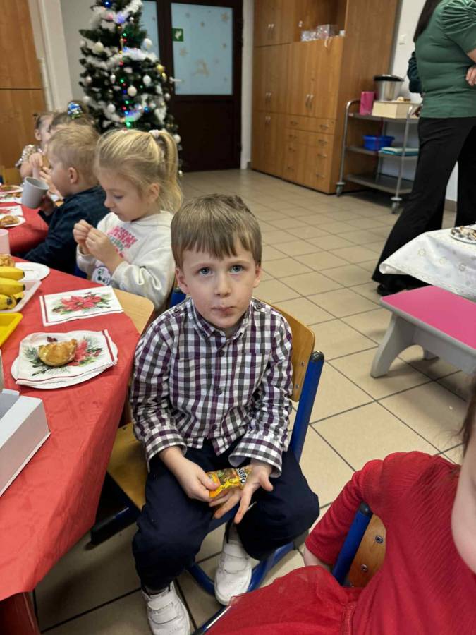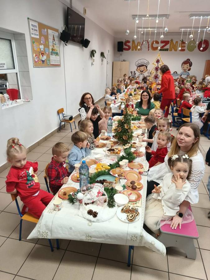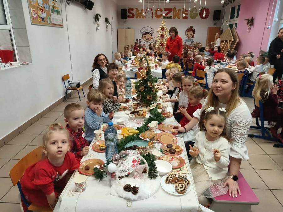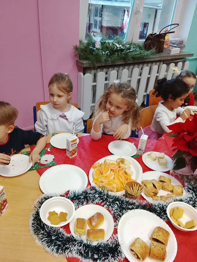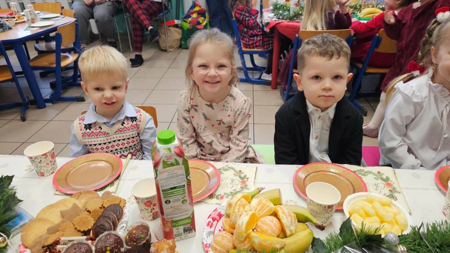 Dziś grupy Ślimaczki, Jagódki, Kropeczki, Motylki i Pszczółki spotkały się przy wigilijnym stole.