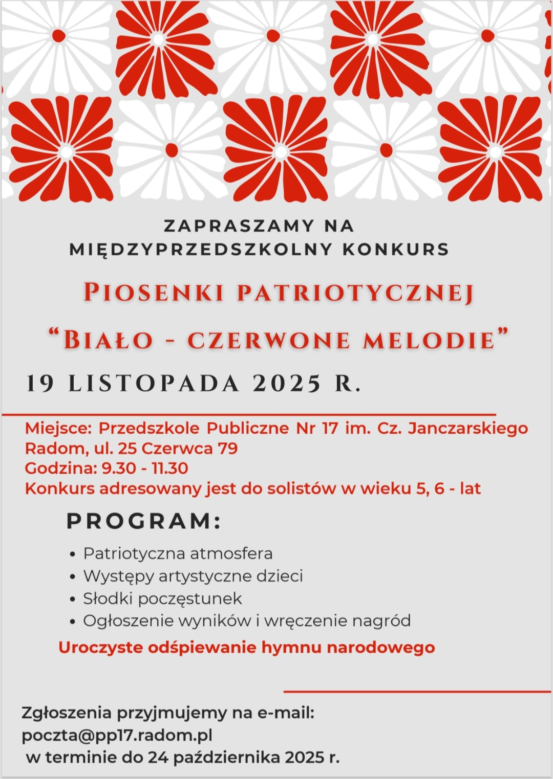 Zapraszamy wszystkie Przedszkola z Radomia do udziału w Międzyprzedszkolnym Konkursie Piosenki Patriotycznej "Biało - Czerwone Melodie". Stanowi on doskonałą okazję do uczczenia historii Polski i pielęgnowania ojczystych tradycji poprzez śpiewanie patriotycznych piosenek. Konkurs ma na celu wspieranie talentów i budowanie dumy z wolnej Polski, a jego kulminacją będzie wspólne odśpiewanie Hymnu Narodowego.