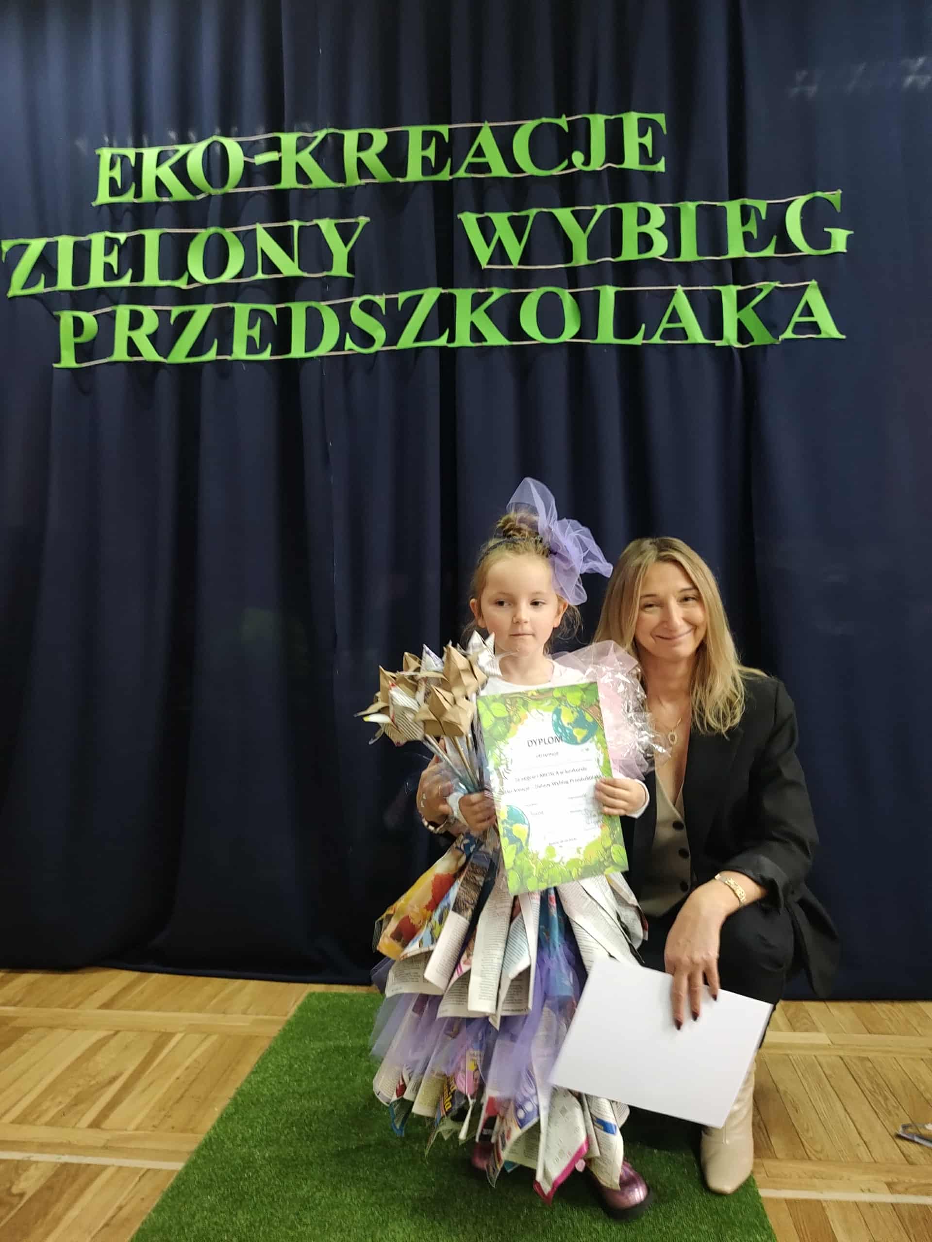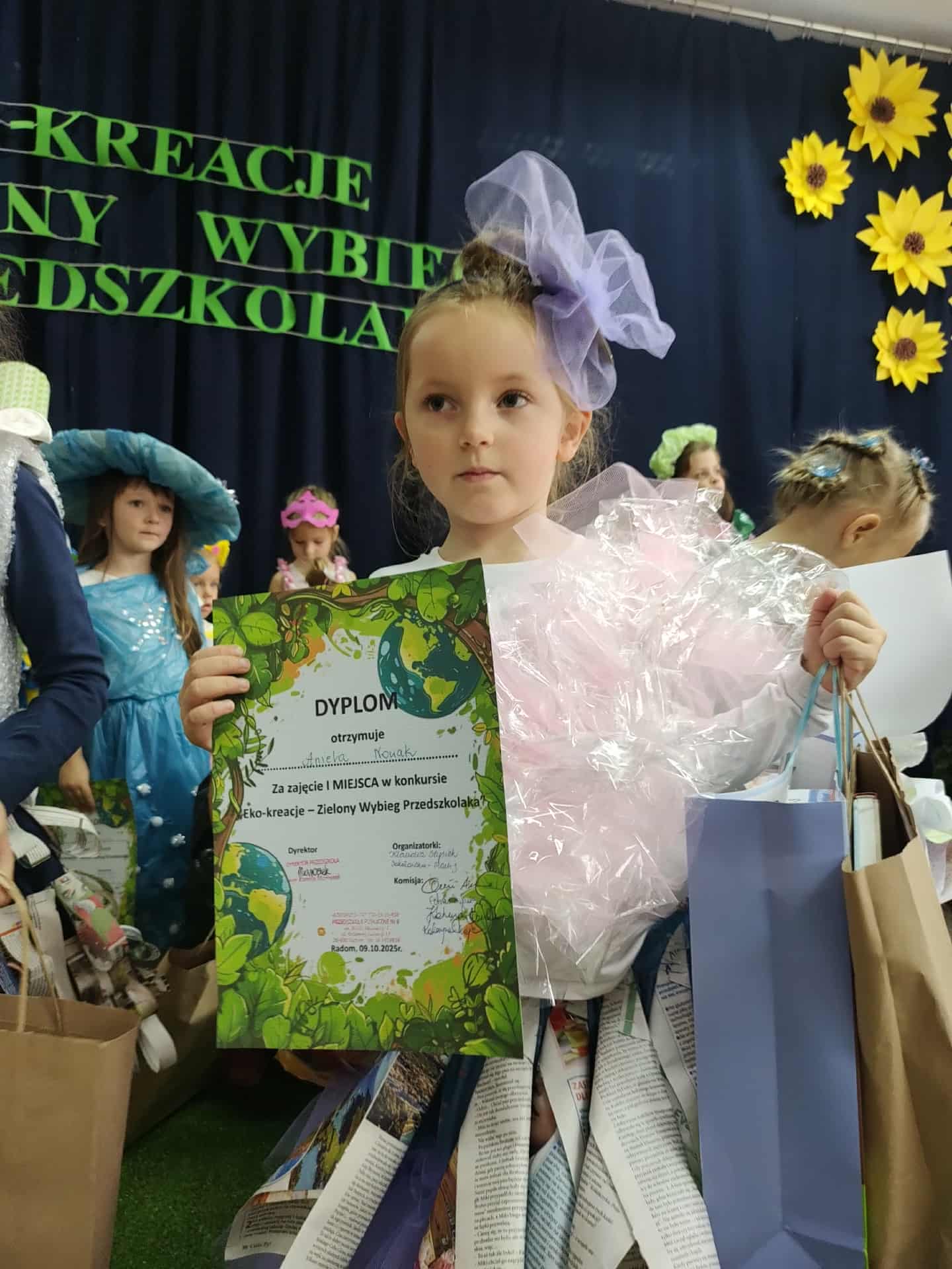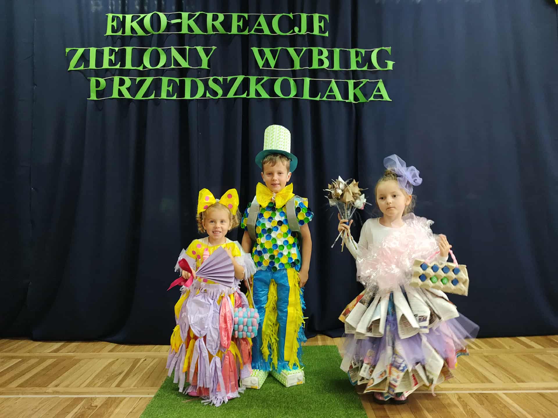 W dniu 9 października trójka naszych reprezentantów - Klara z grupy Ślimaczki, Anielka z grupy Motylki i Ksawery z grupy Supersmyki - reprezentowała nasze przedszkole podczas Miedzyprzedszkolnego Konkursu "Eko- kreacje- zielony wybieg przedszkolaka", którego organizatorem było PP nr 8 im. Króla Maciusia w Radomiu. Zadaniem uczestników było stworzenie stroju ekologicznego z wykorzystaniem surowców wtórnych, a następnie zaprezentowanie go na Pokazie Mody. Wszystkie dzieci, biorące udział w konkursie miały wspaniałe kreacje i zasłużyły na nagrodę. Tym bardziej jesteśmy dumni z naszej Anielki, która zajęła I miejsce.
