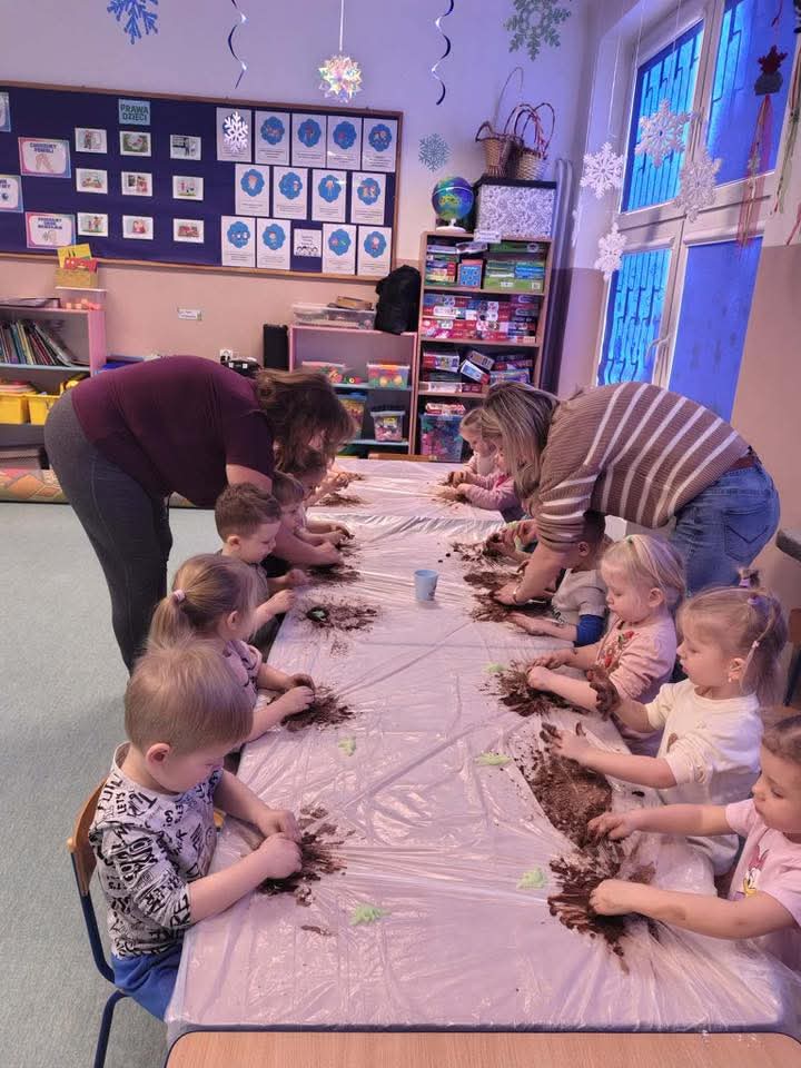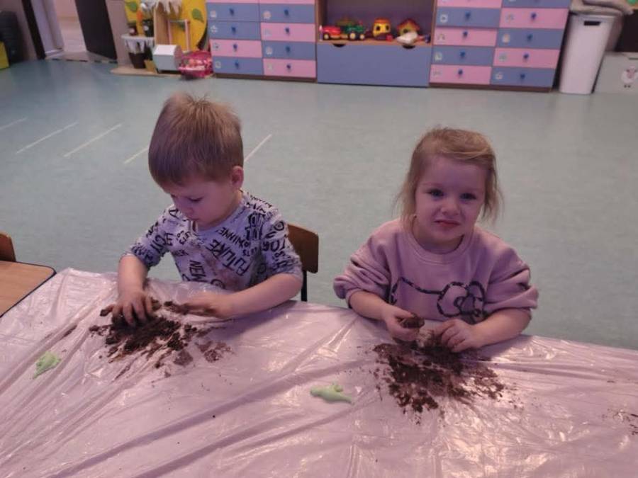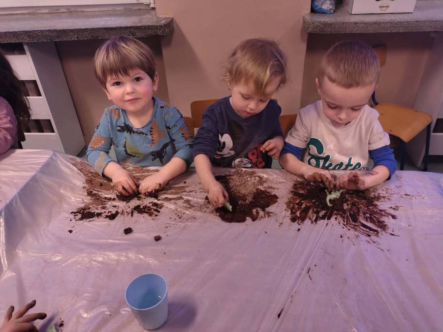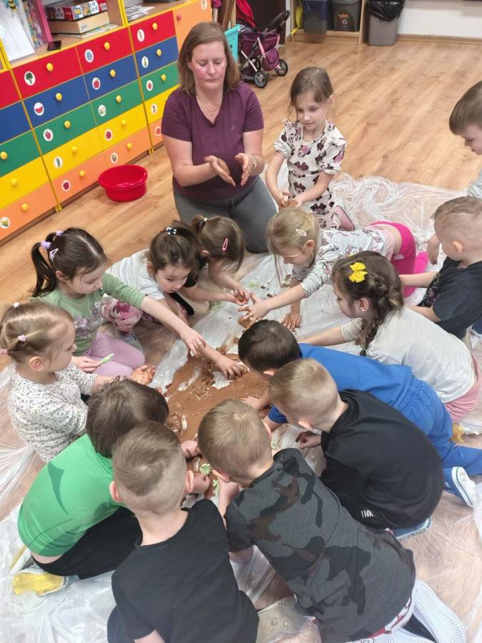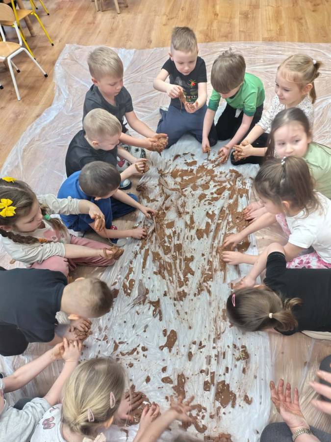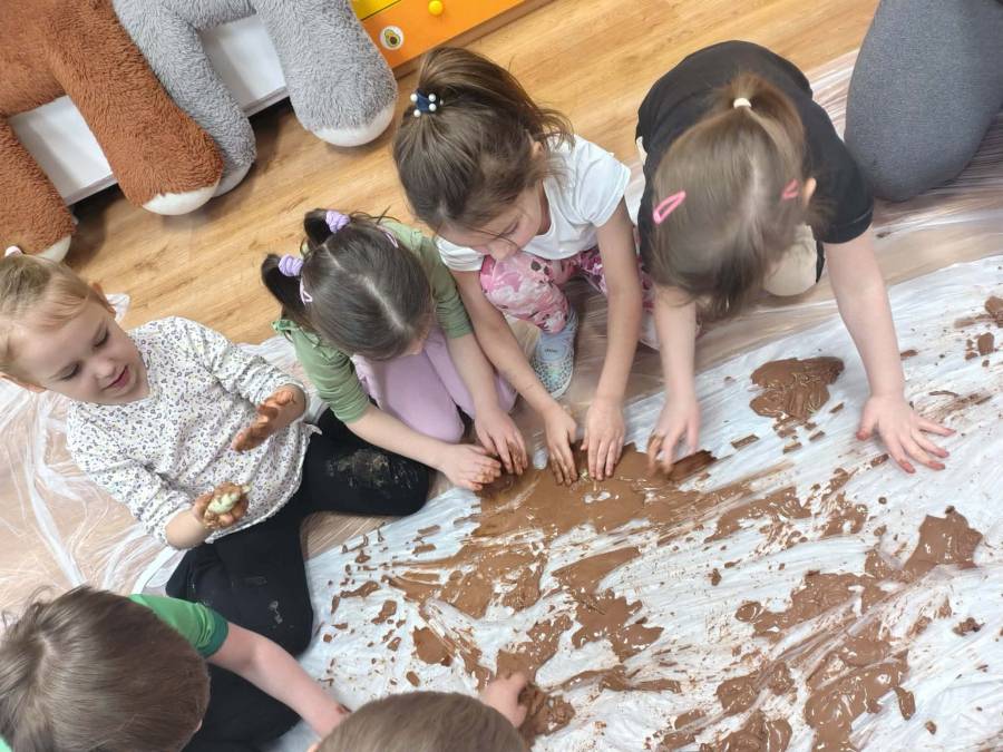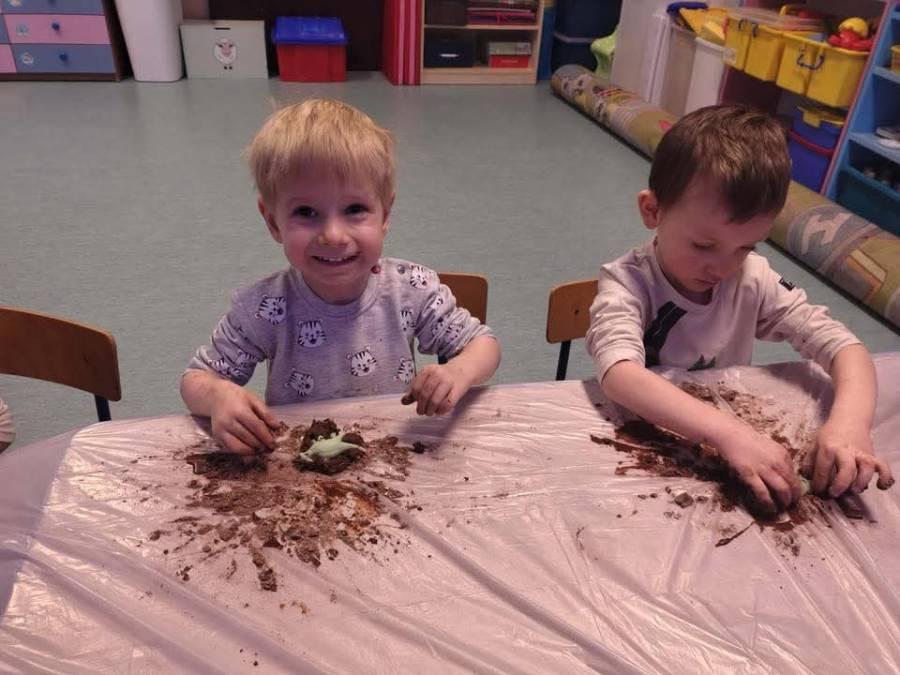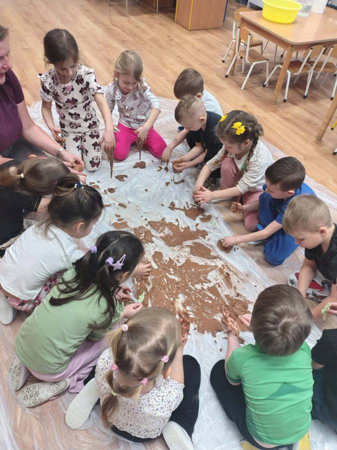 Dzieci wykonywały ćwiczenia oddechowe, następnie tworzyły prawdziwą dżunglę z liści i błoto (ciecz nieniutonowska). Po skończonej pracy przybyły dinozaury i zabawy nie było końca.