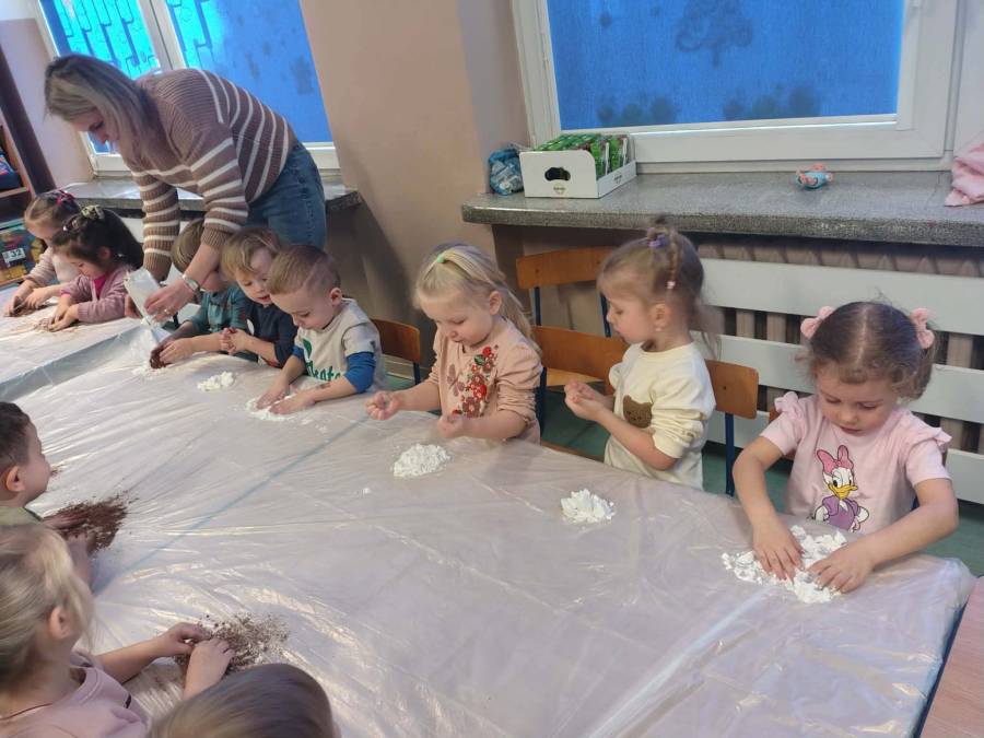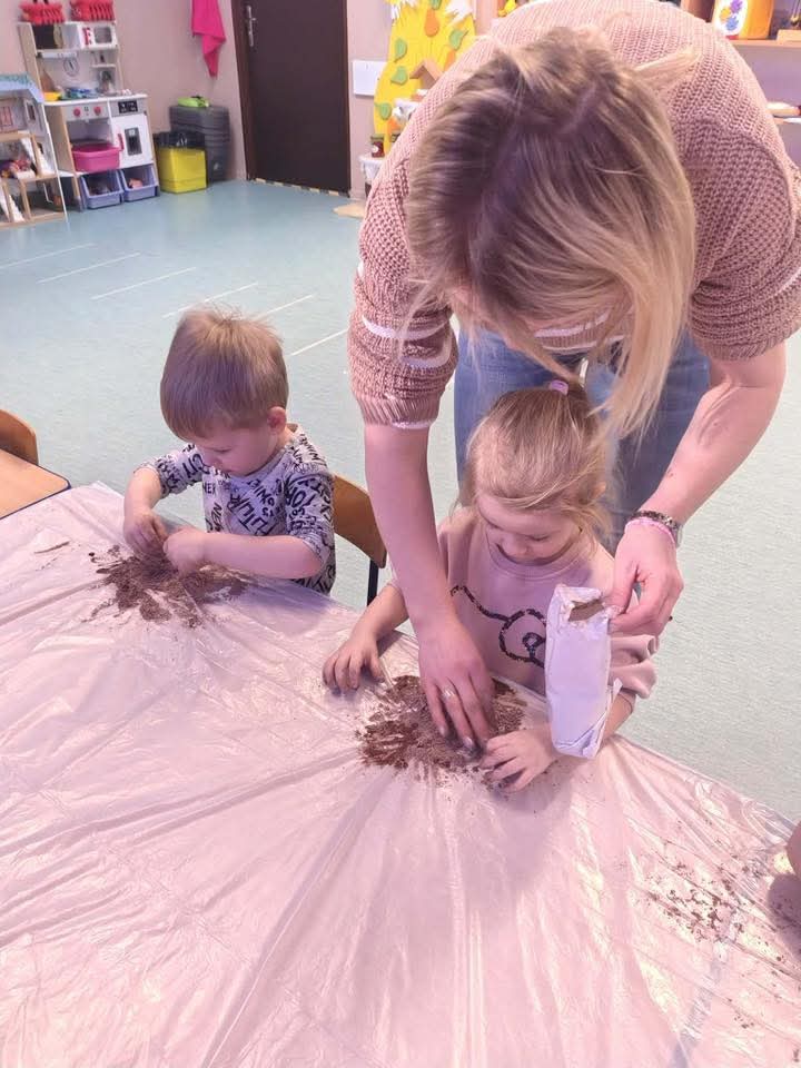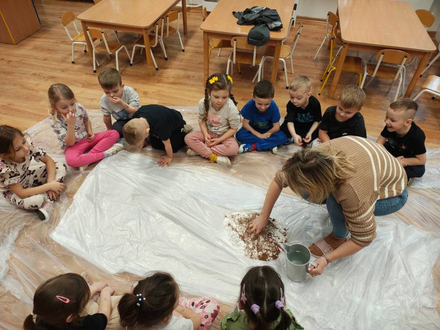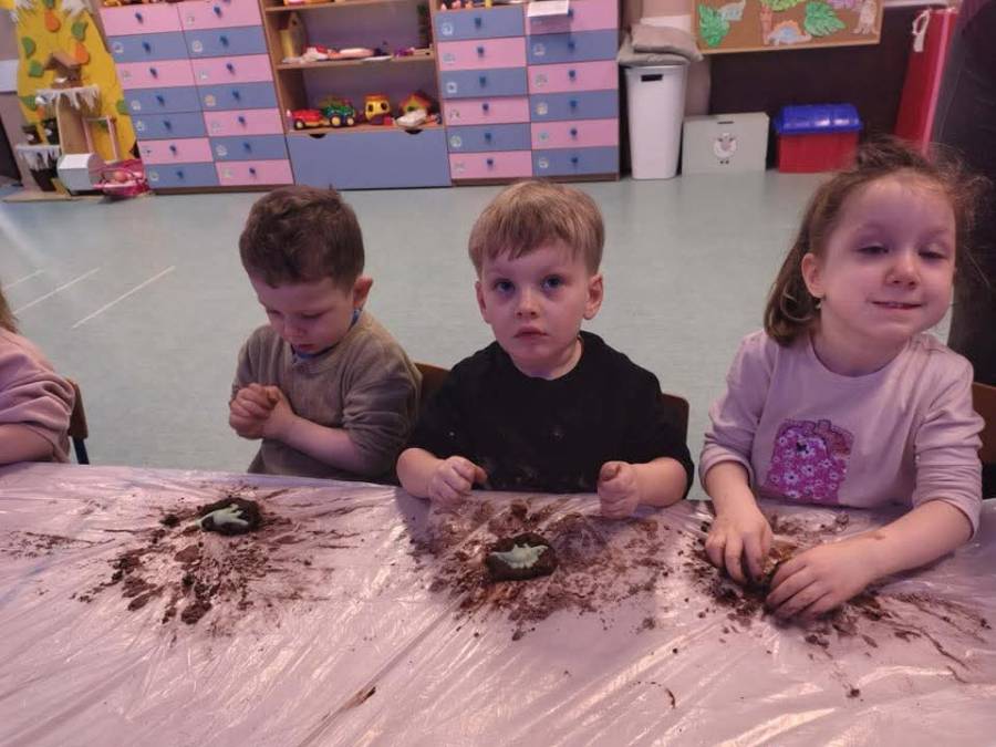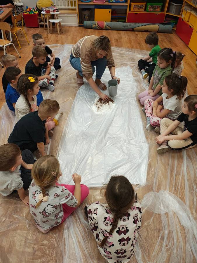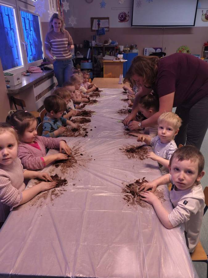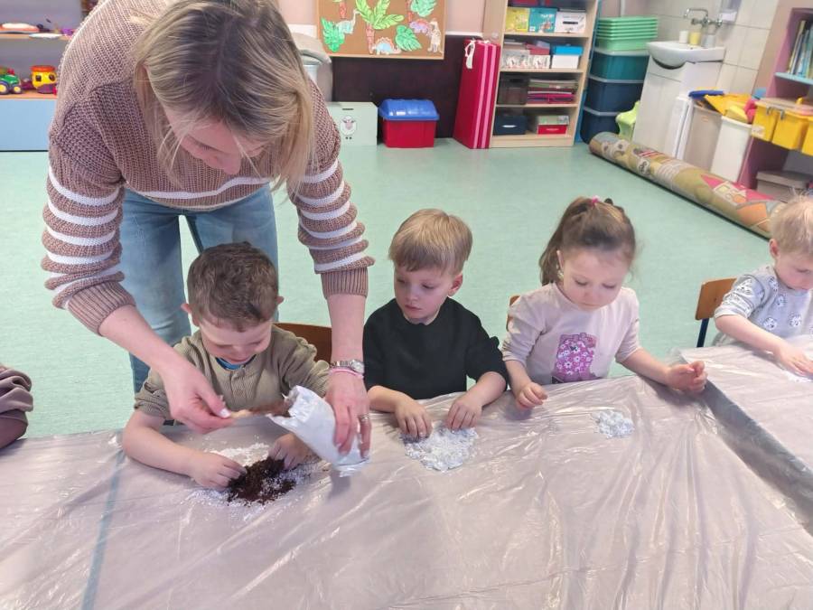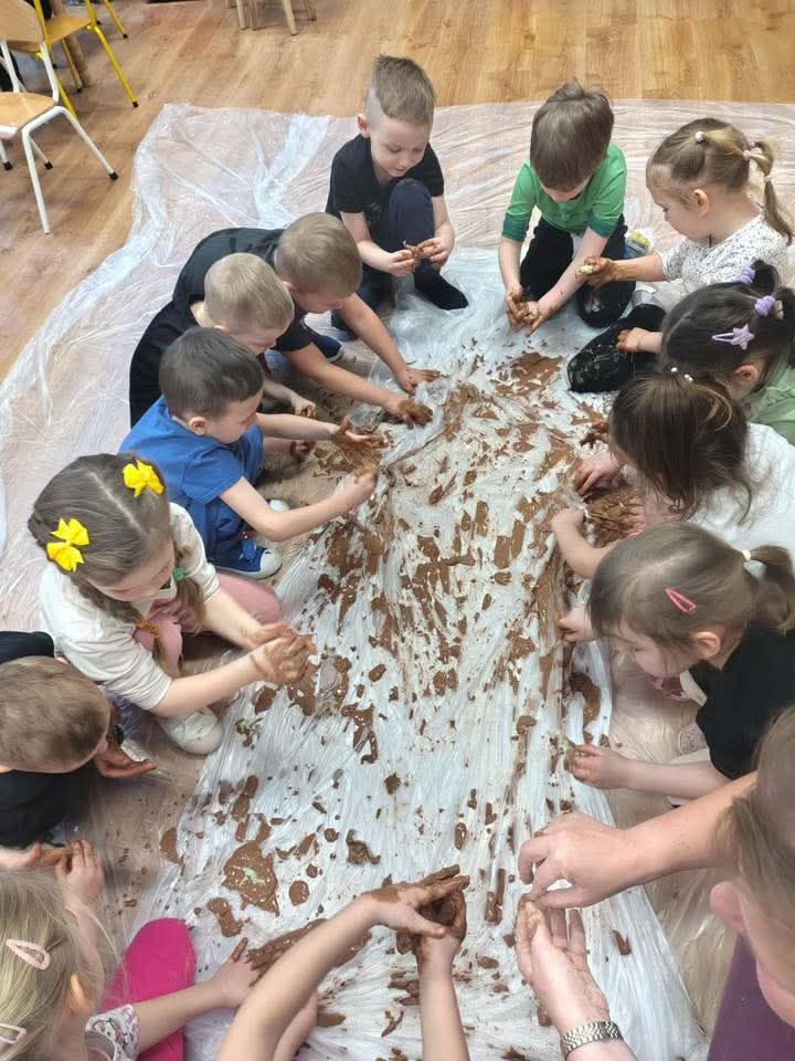 Dzieci wykonywały ćwiczenia oddechowe, następnie tworzyły prawdziwą dżunglę z liści i błoto (ciecz nieniutonowska). Po skończonej pracy przybyły dinozaury i zabawy nie było końca.