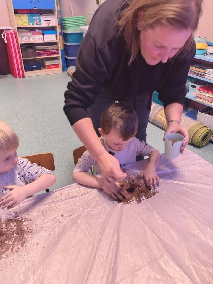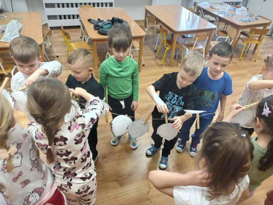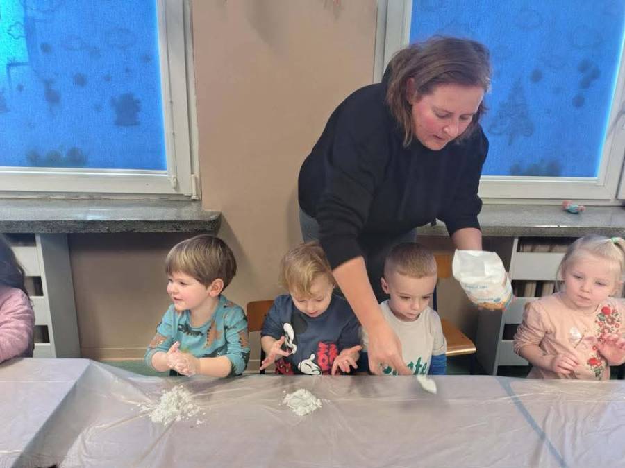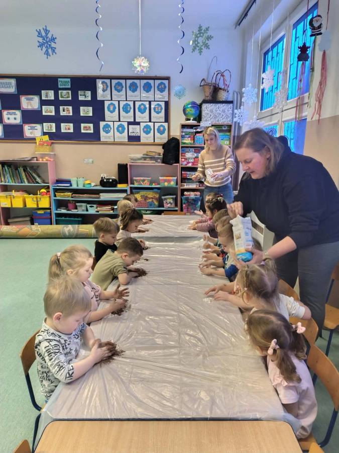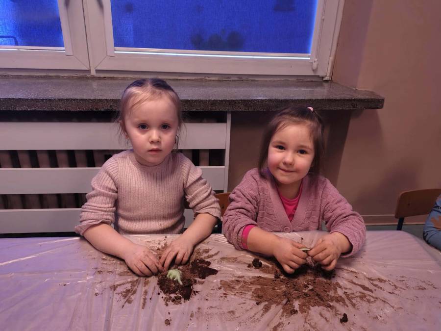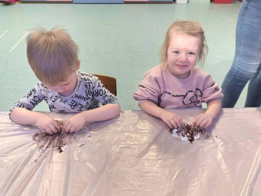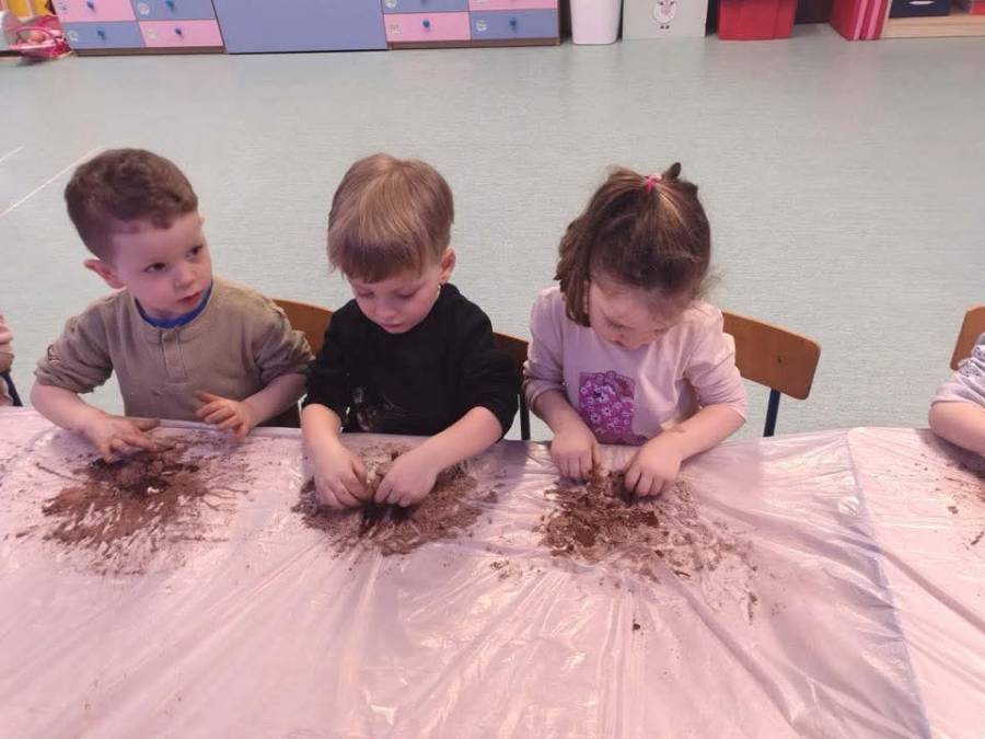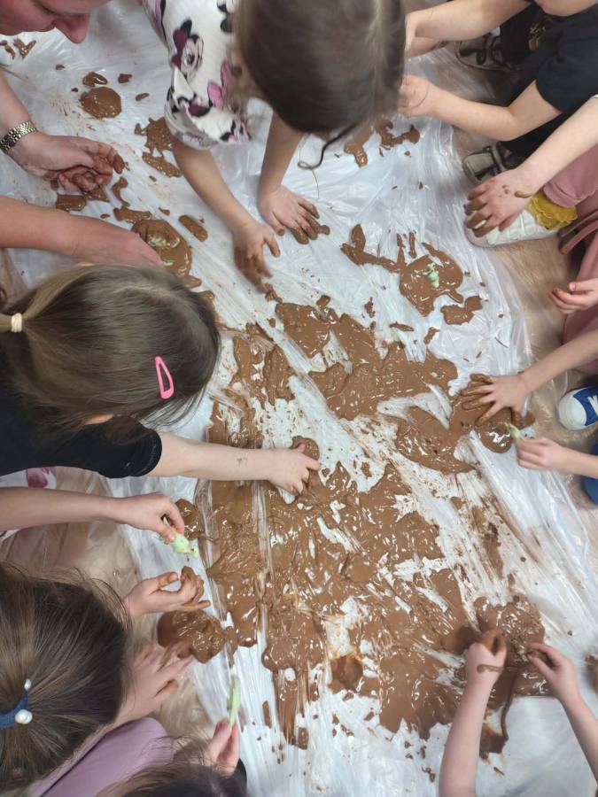 Dzieci wykonywały ćwiczenia oddechowe, następnie tworzyły prawdziwą dżunglę z liści i błoto (ciecz nieniutonowska). Po skończonej pracy przybyły dinozaury i zabawy nie było końca.