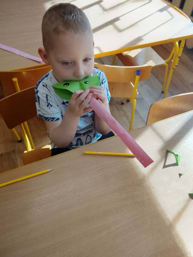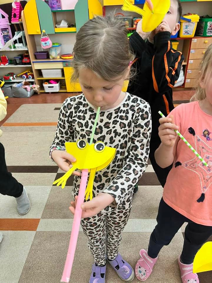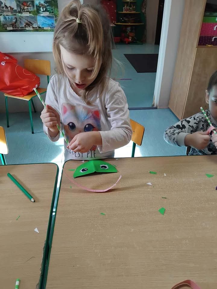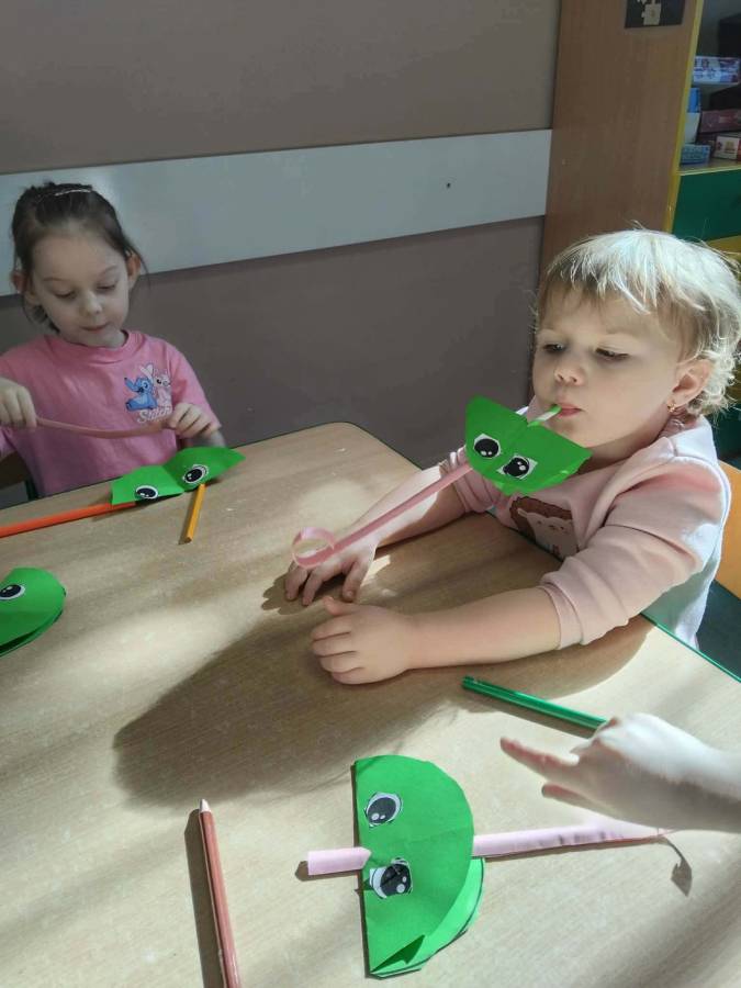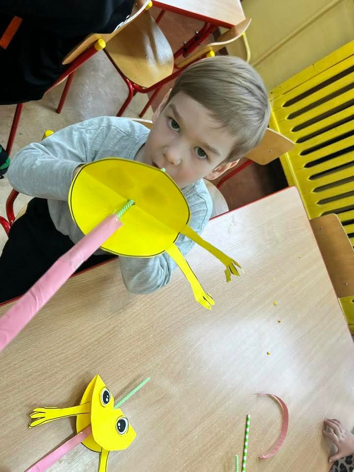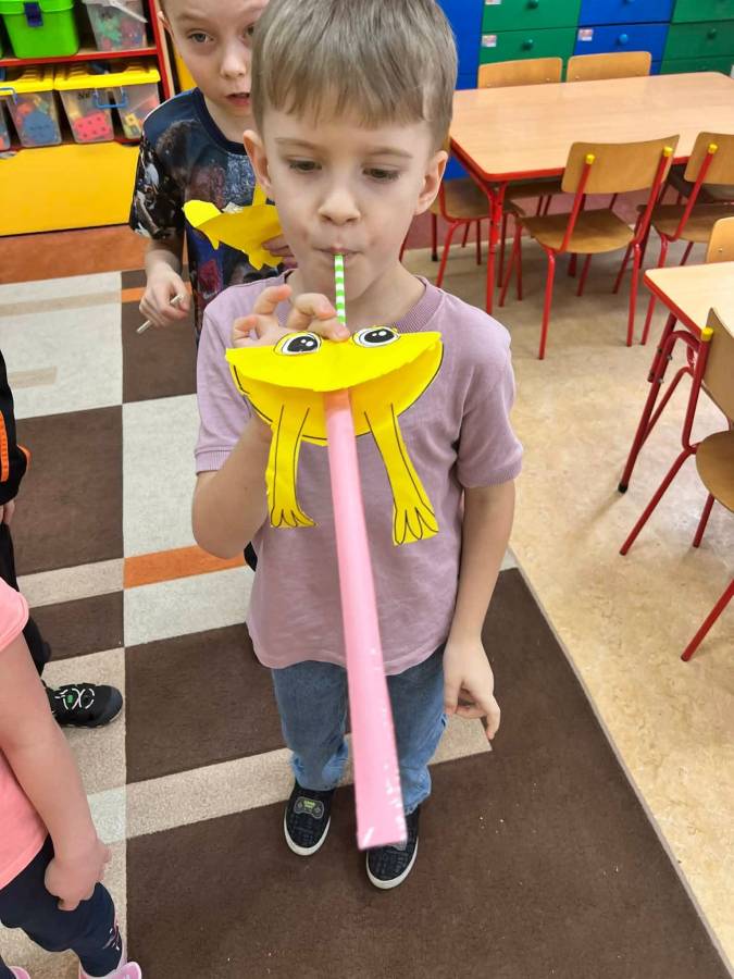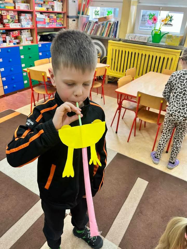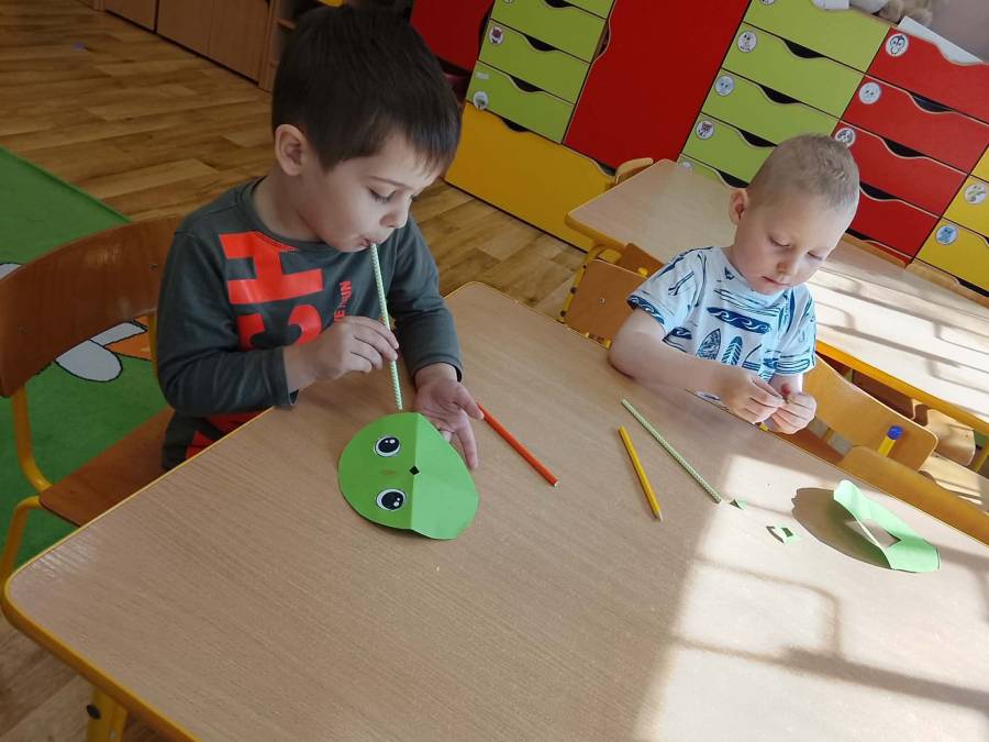 W każdej grupie zostały przeprowadzone zajęcia logopedyczne. Dzieci wykonywały ćwiczenia usprawniające artykulację, ćwiczyły motorykę małą i dużą, a także rozwijały umiejętności oddechowe. W trakcie zajęć dzieci przygotowały logopedyczne żabki - wiosenne pomocnice wykorzystywane podczas ćwiczeń oddechowych.