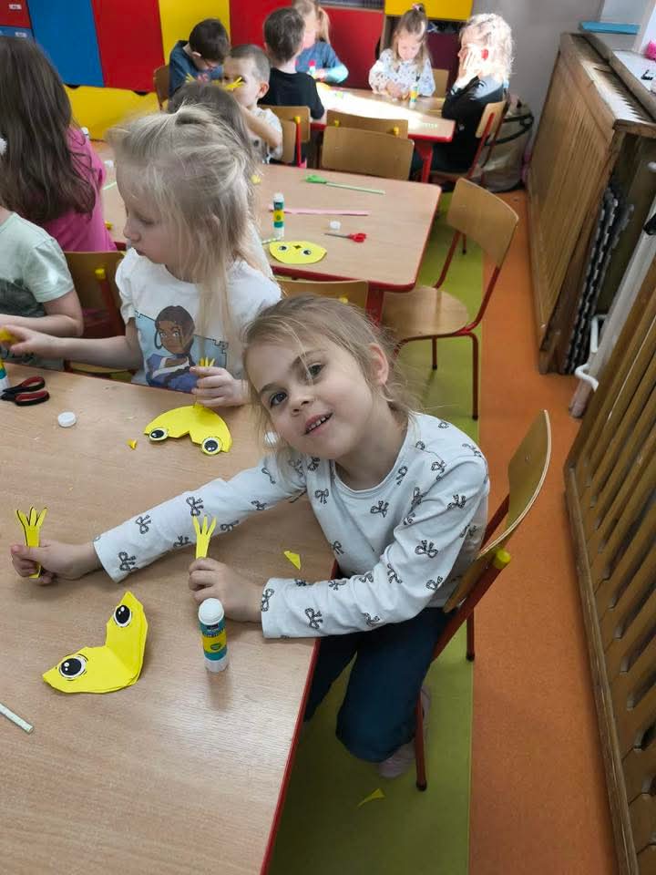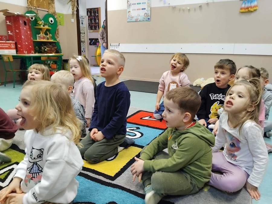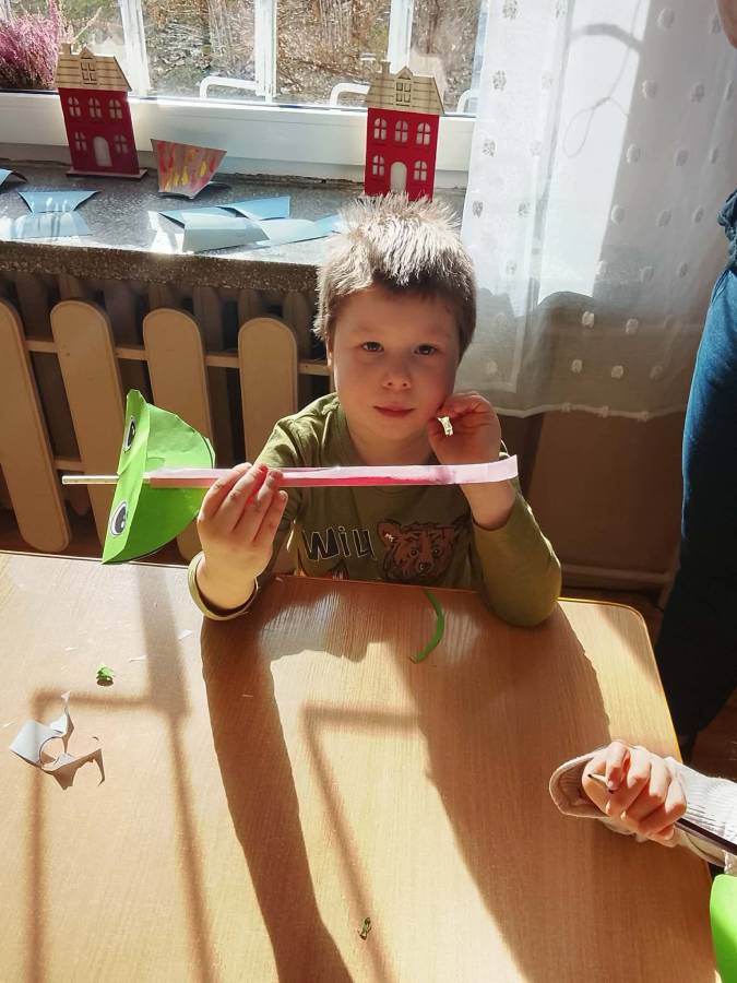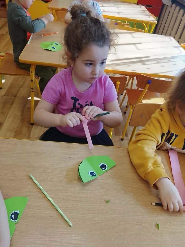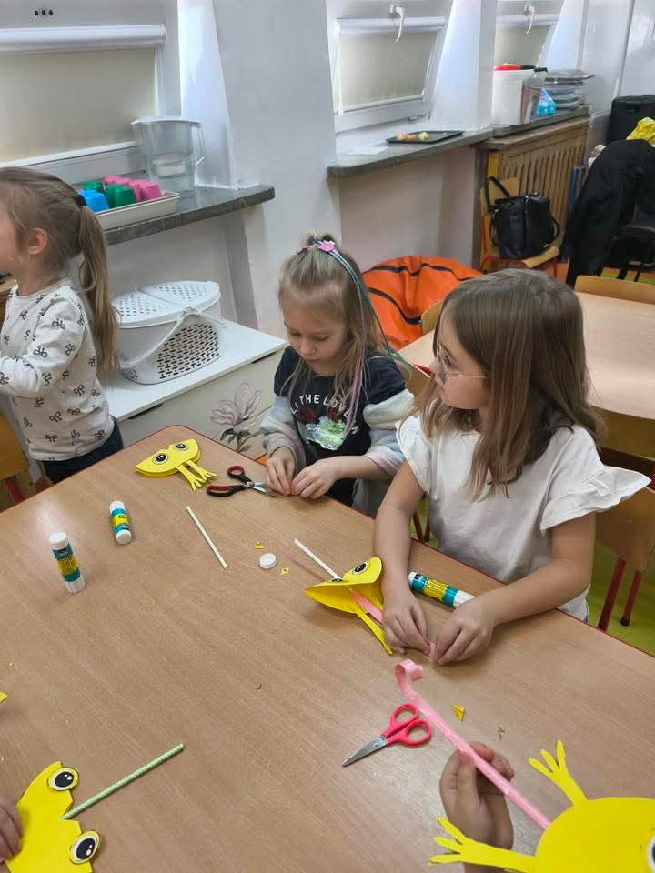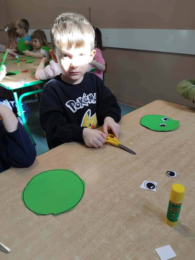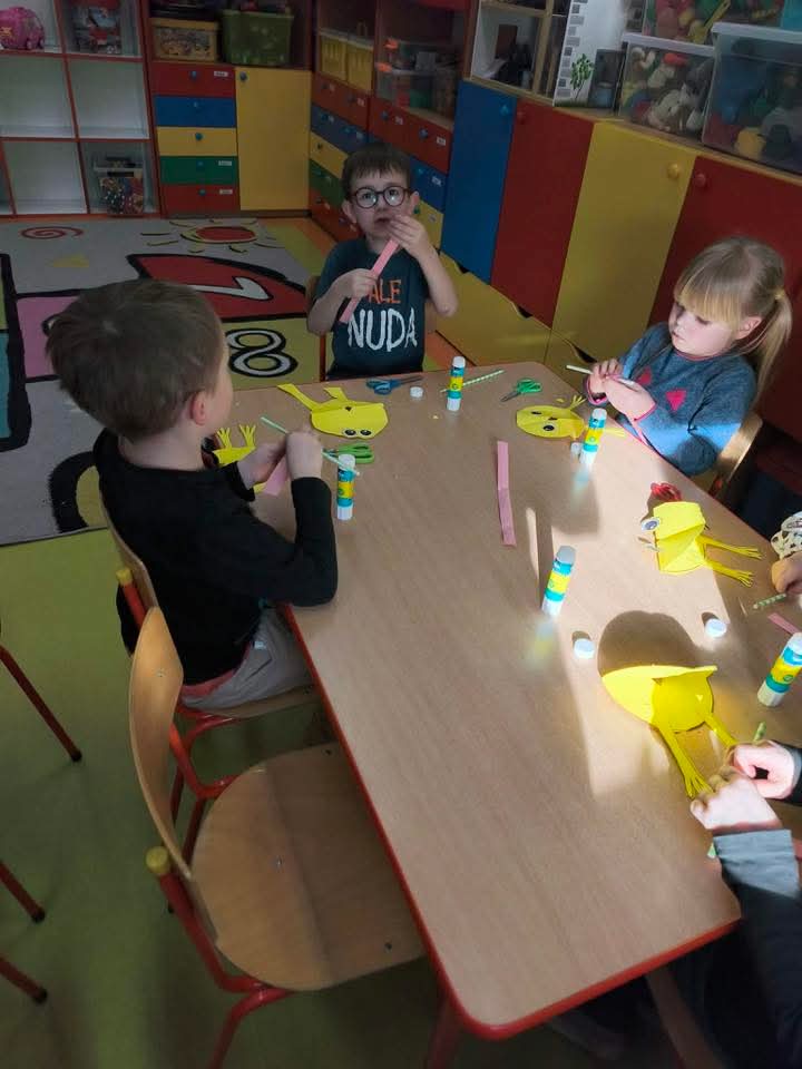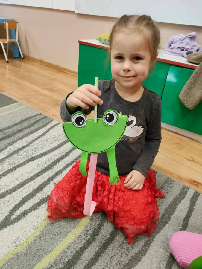 W każdej grupie zostały przeprowadzone zajęcia logopedyczne. Dzieci wykonywały ćwiczenia usprawniające artykulację, ćwiczyły motorykę małą i dużą, a także rozwijały umiejętności oddechowe. W trakcie zajęć dzieci przygotowały logopedyczne żabki - wiosenne pomocnice wykorzystywane podczas ćwiczeń oddechowych.