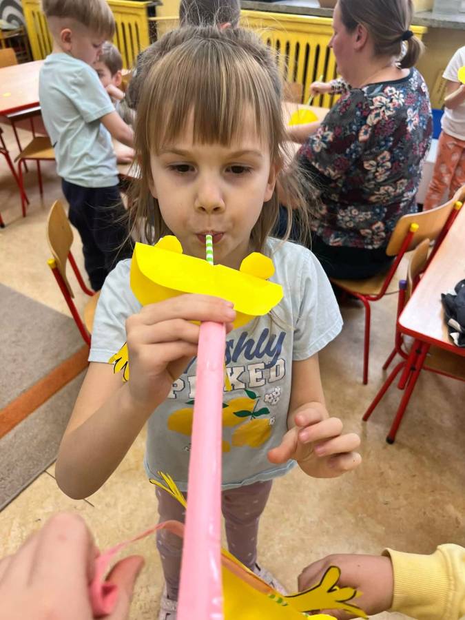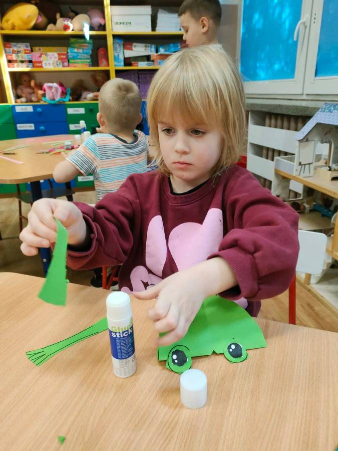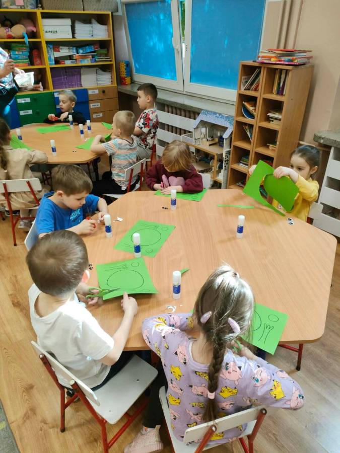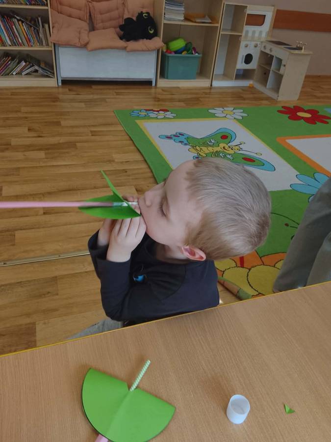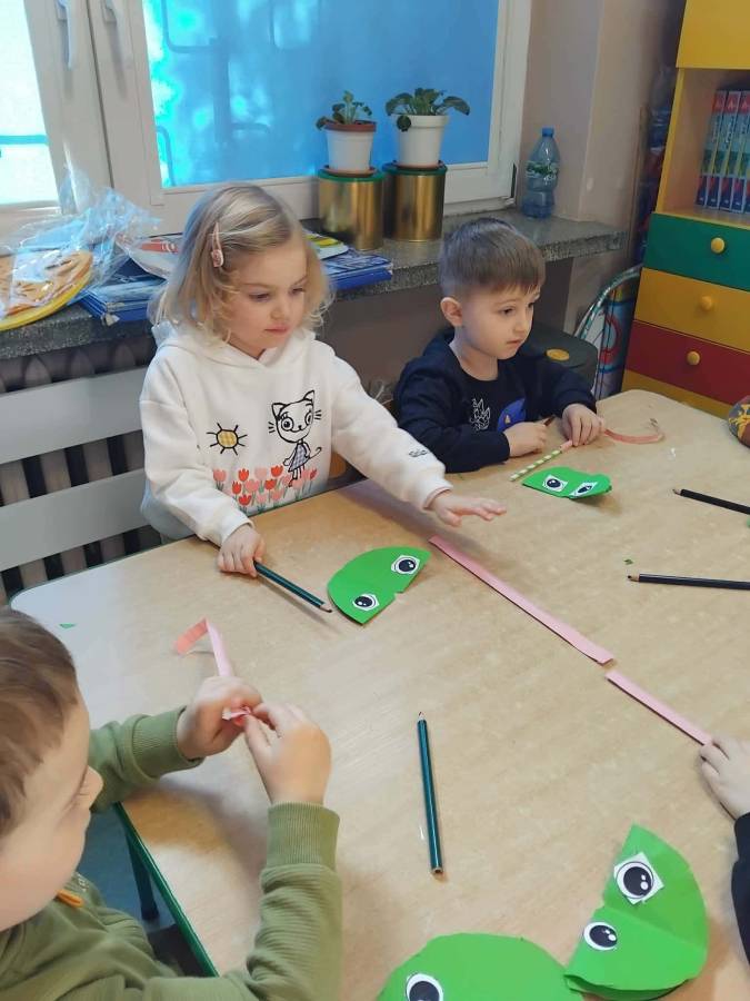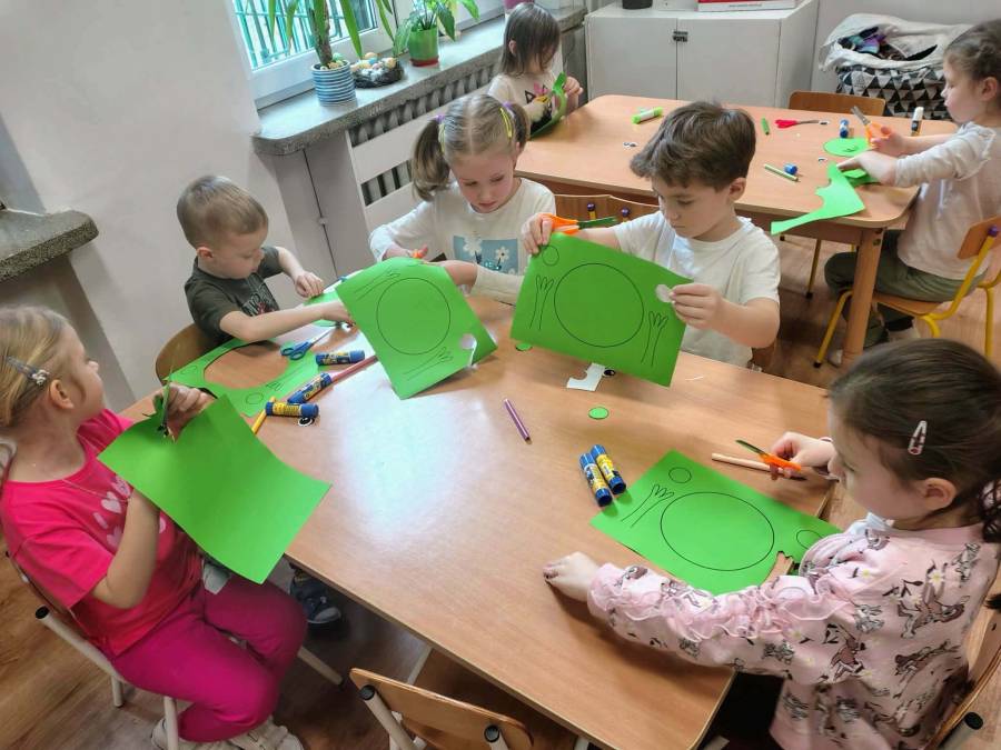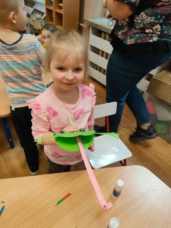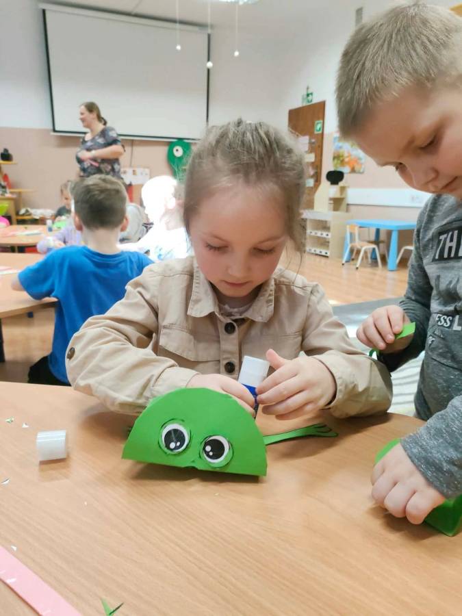 W każdej grupie zostały przeprowadzone zajęcia logopedyczne. Dzieci wykonywały ćwiczenia usprawniające artykulację, ćwiczyły motorykę małą i dużą, a także rozwijały umiejętności oddechowe. W trakcie zajęć dzieci przygotowały logopedyczne żabki - wiosenne pomocnice wykorzystywane podczas ćwiczeń oddechowych.