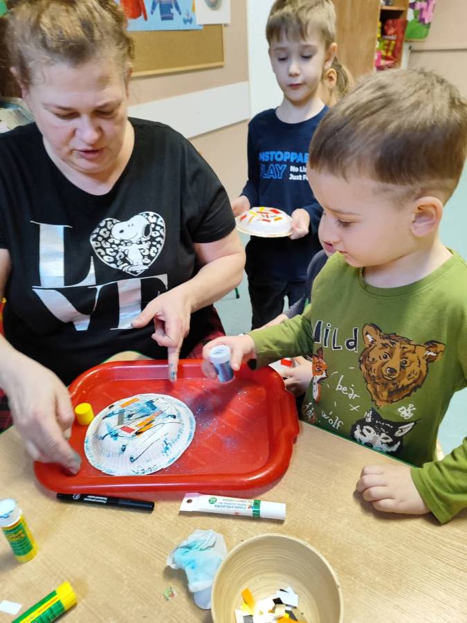 Dzieci własnoręcznie wykonywały kolorowe pizze, jednocześnie realizując ćwiczenia artykulacyjne. Następnie z zainteresowaniem wysłuchały bajki logopedycznej o pizzy i odpowiadały na pytania sprawdzające zrozumienie treści. W dalszej części nie zabrakło ruchu i dobrej zabawy - były zabawy z chustą Klanza, taniec do piosenki o pizzy, opowiadanie historyjek na podstawie obrazków oraz gra logopedyczna. Dzieci rozwijały mowę i słownictwo.